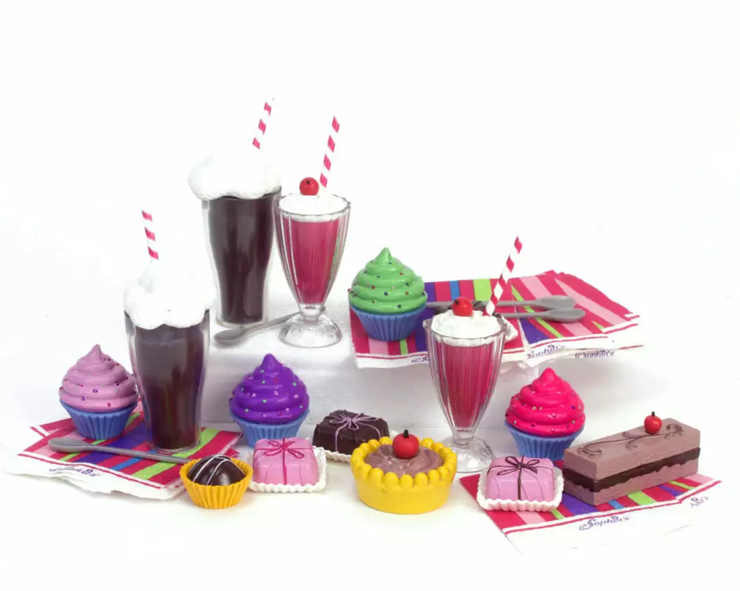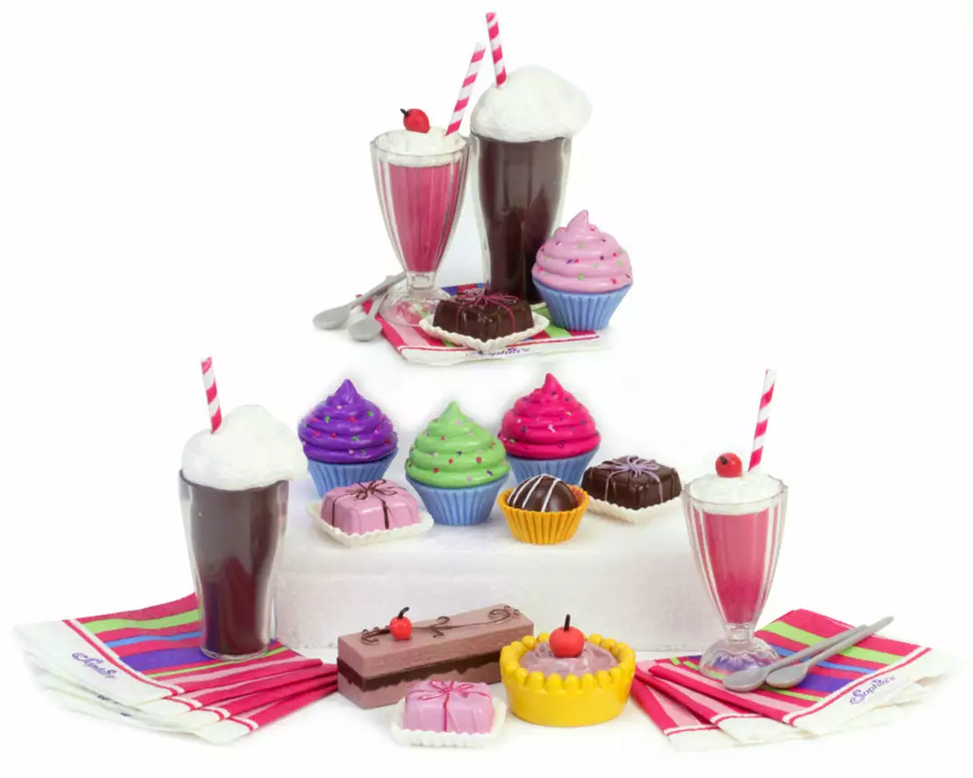 - ACCESSORIES INCLUDED: Comes with cupcakes, petit fours, milkshakes, ice cream floats, bon bon, cheery chocolate mousse, chocolate torte, napkins, and spoons