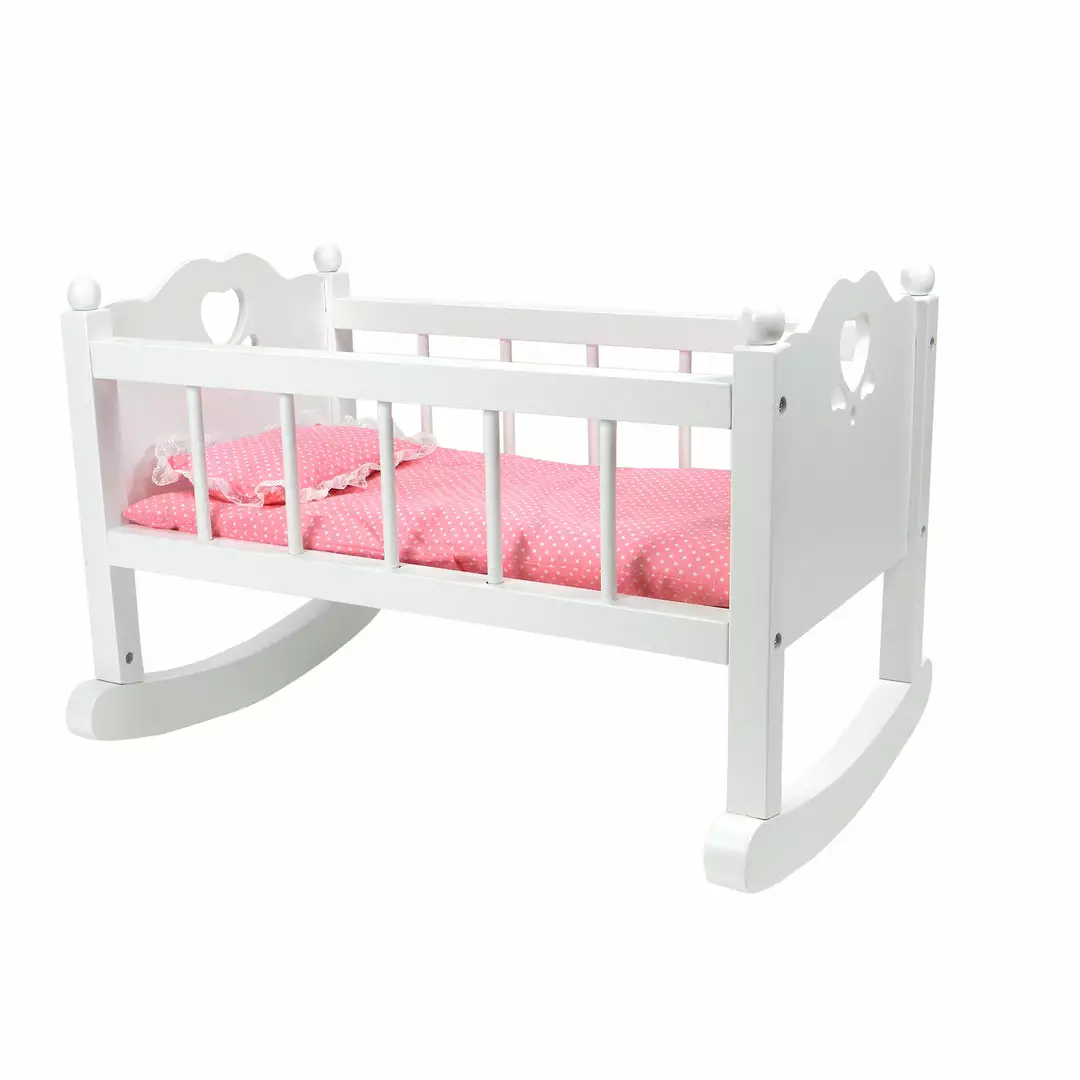 - DOLL CRADLE: Features a classic white design with pink polka dot bedding and pillow to give your little one a stylish piece of furniture to play with