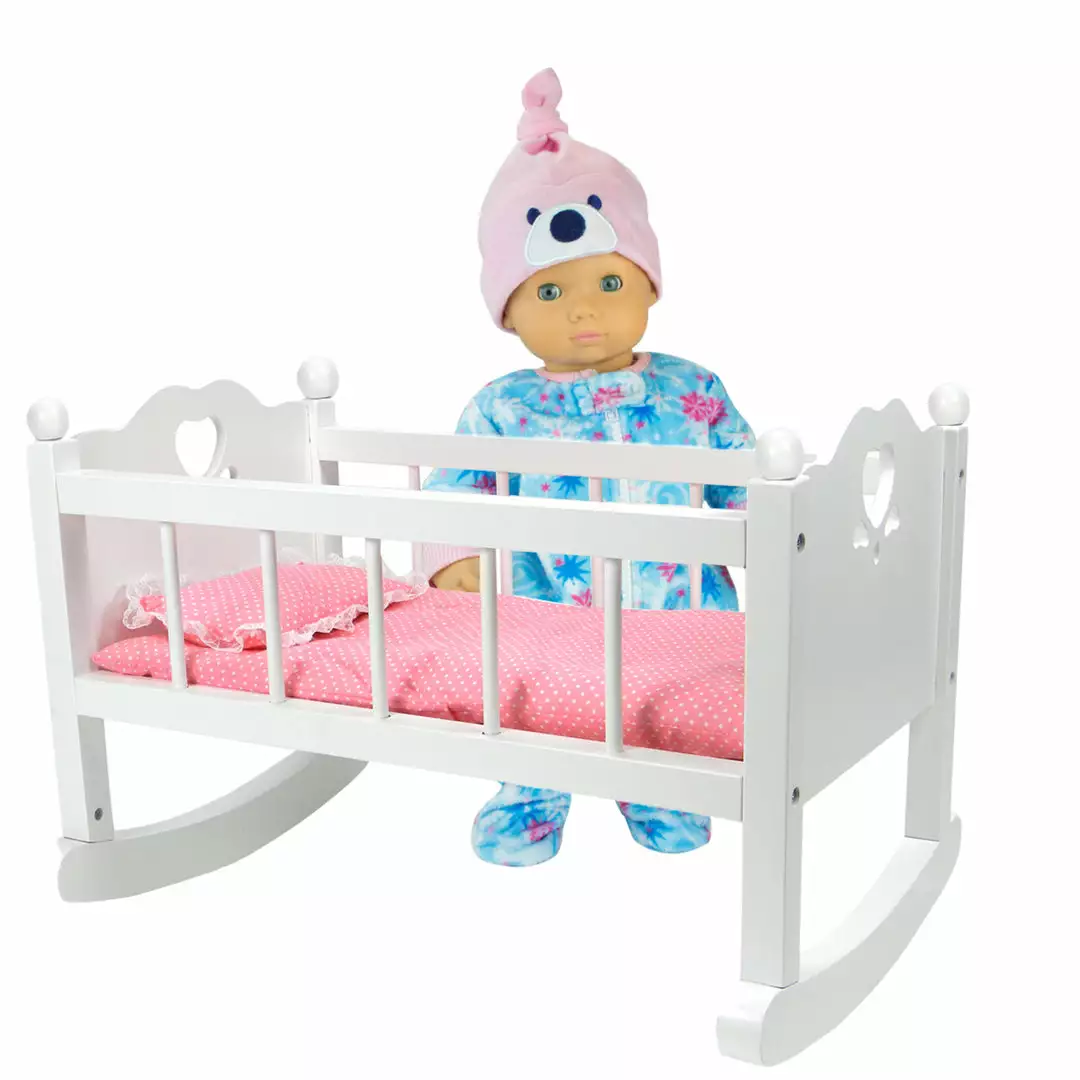 Give your little one a stylish piece of furniture to keep their dolls comfortable with the Sophia’s by Teamson Kids High End Baby Cradle. This detailed cradle features a classic white design with slatted sides, heart cutouts, pink polka dot bedding and pillow to complete their doll living space. The interactive rocking design allows your little one to lull their baby doll to sleep for more engaging play. Made for 15″ dolls, the set is compatible with Bitty Baby, Madame Alexander, Corolle, and more! The cradle measures approximately 21″ x 14″ x 15″ when assembled. Dolls not included.