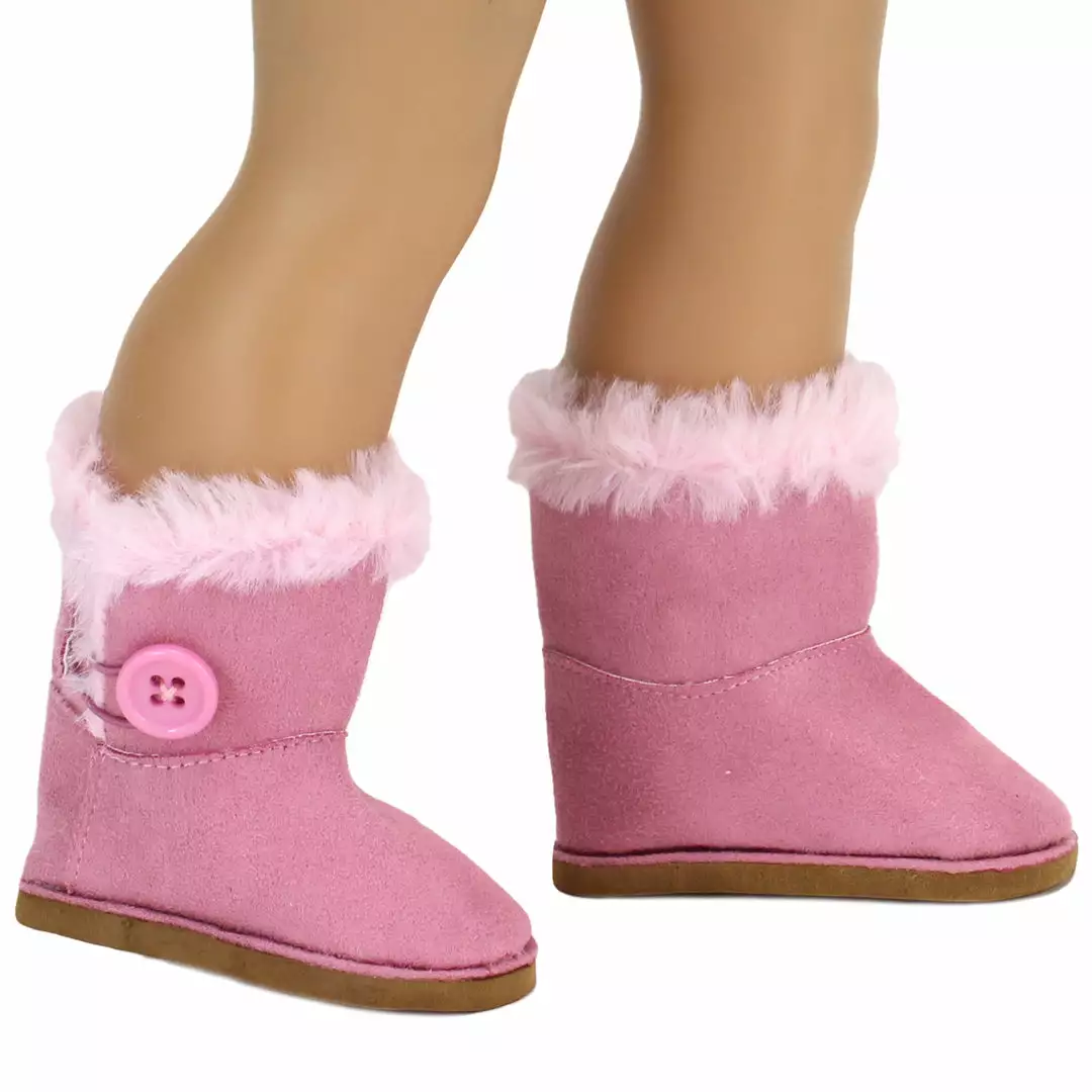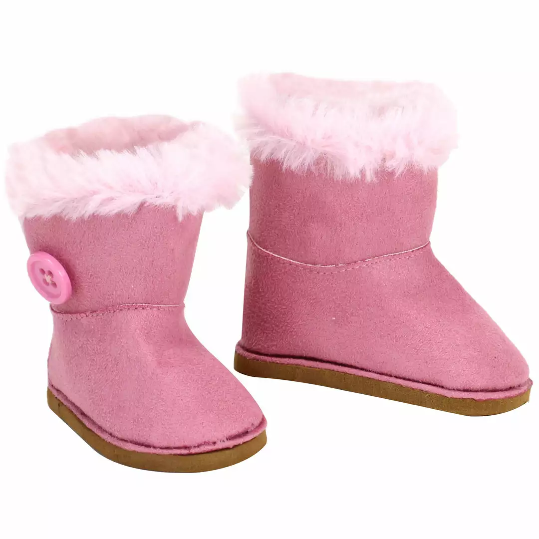 - INCLUDES: 1 pair of pink suede style boots with fur lining the inside to keep your doll’s feet cozy and warm. Pink side button makes it easy to dress your doll before you head out into the cold!