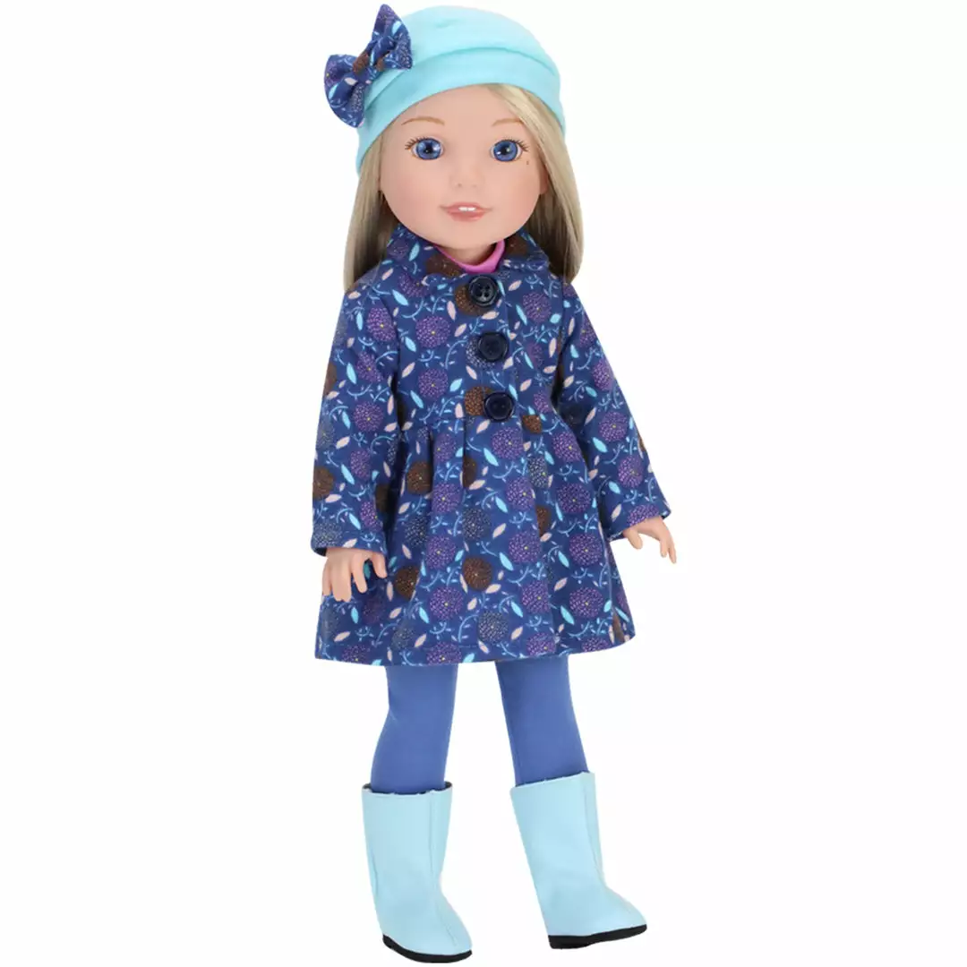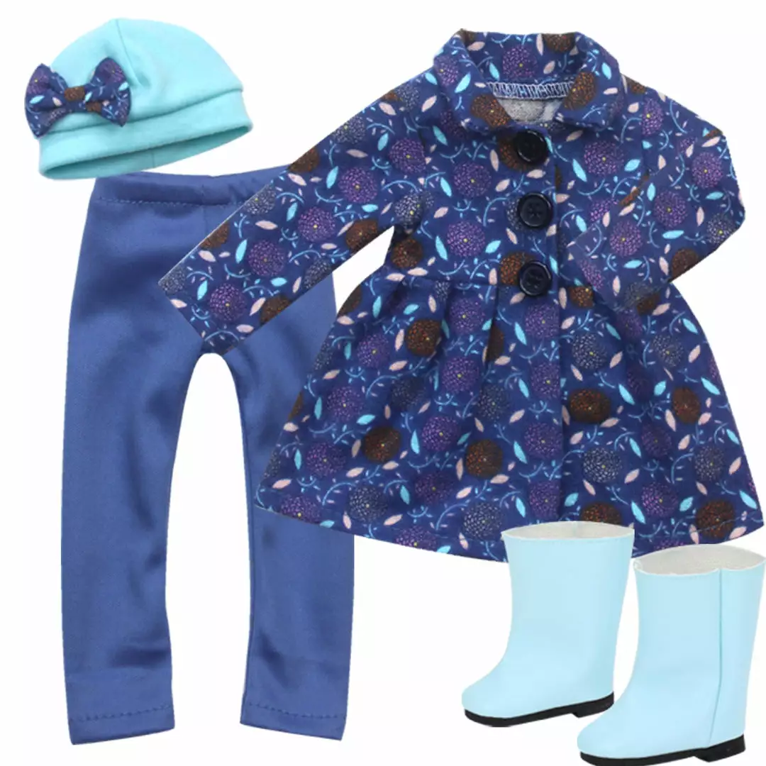 - INCLUDED: This complete set includes a floral print jacket, blue leggings, beanie-style winter hat and light blue boots sized for 14.5 inch dolls.