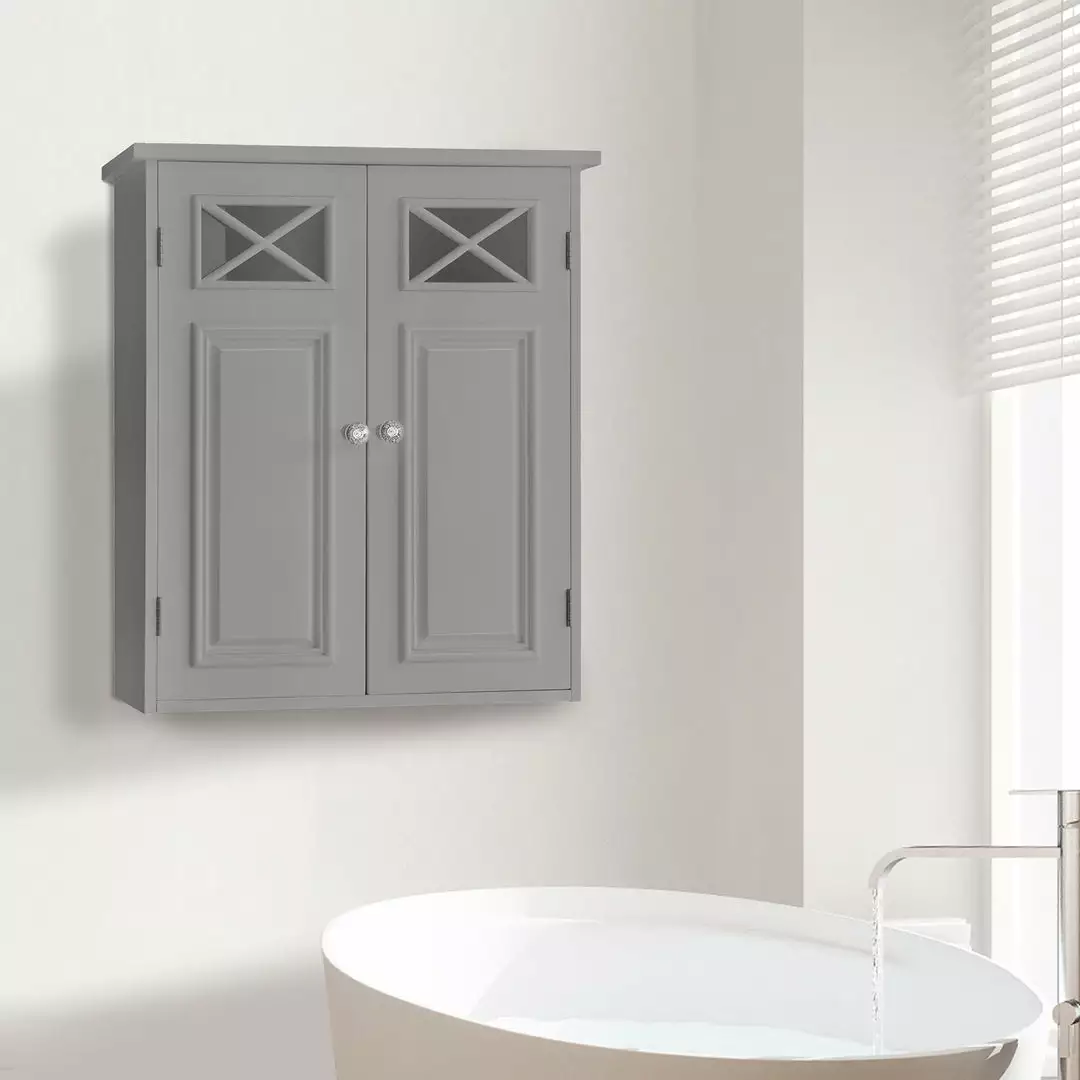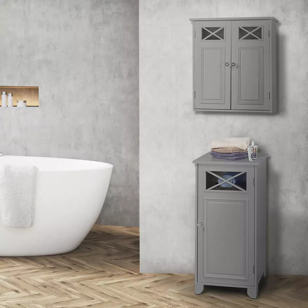 Upgrade your home storage while adding classic decor with the Teamson Homes Dawson Contemporary Wooden Removable Cabinet. This decorative cabinet features a gray finish with cross molding on the glass-paneled doors and clear knobs for an elevated and stylish addition to your space. The included adjustable shelf helps to reduce clutter and keep your home tidy, and its versatile design can be used in the bedroom, living room, or in any room around the home. Constructed from durable engineered wood, this wall cabinet is built to provide you with long-lasting organization. Easy, step-by-step instructions and all of the hardware needed are included for quick assembly. Purchase this stylish cabinet alone or with other items from the Dawson collection for a cohesive, updated look. The Teamson Homes Dawson Wooden Removable Wall Cabinet with Cross Molding and 2 Doors measures 7″ x 20″ x 24″ to provide removable storage without taking up too much space.