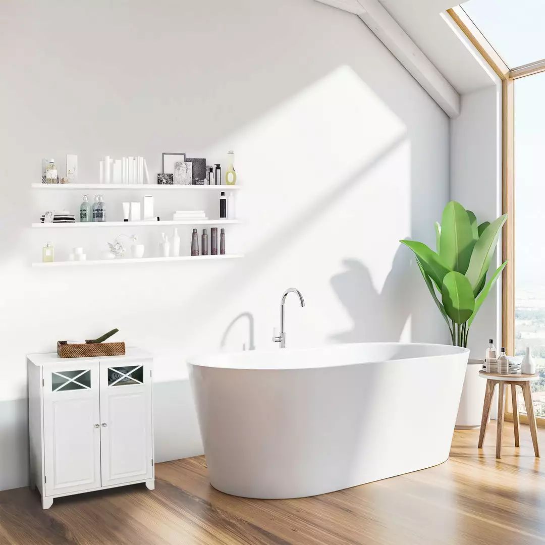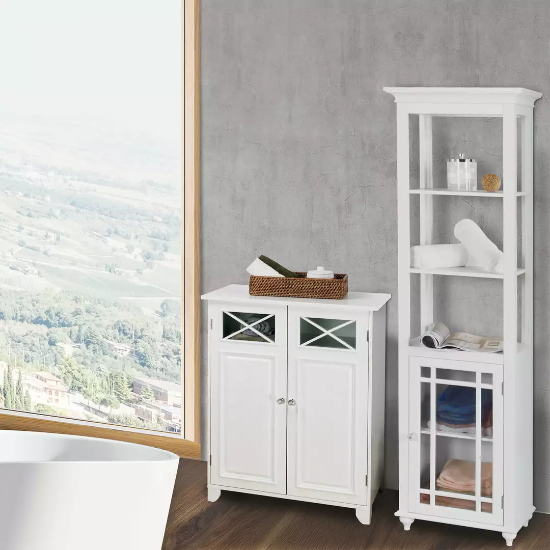 - STYLISH FLOOR CABINET: Features a classic white finish with cross molding on the glass-paneled doors and clear knobs for a beautiful addition to your space