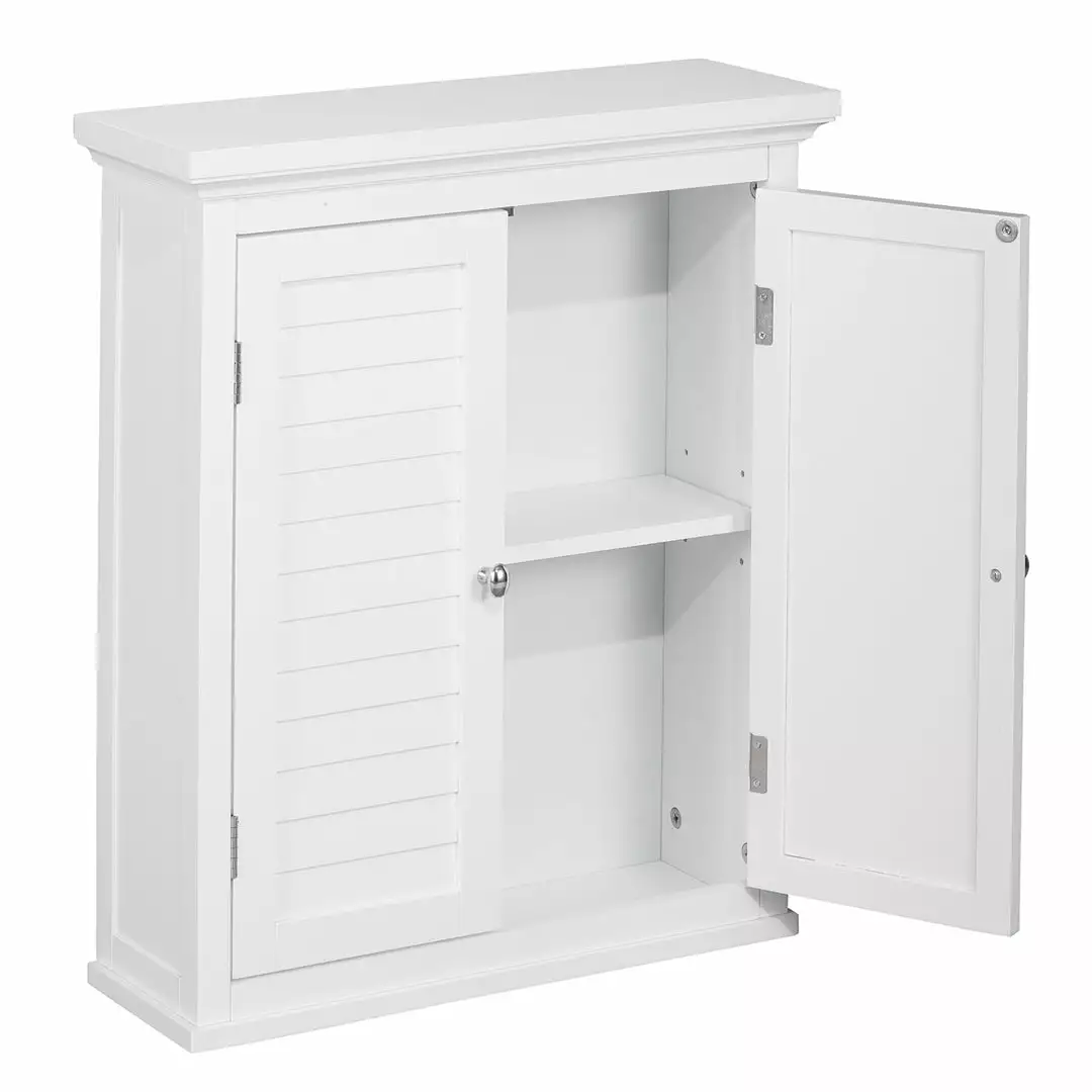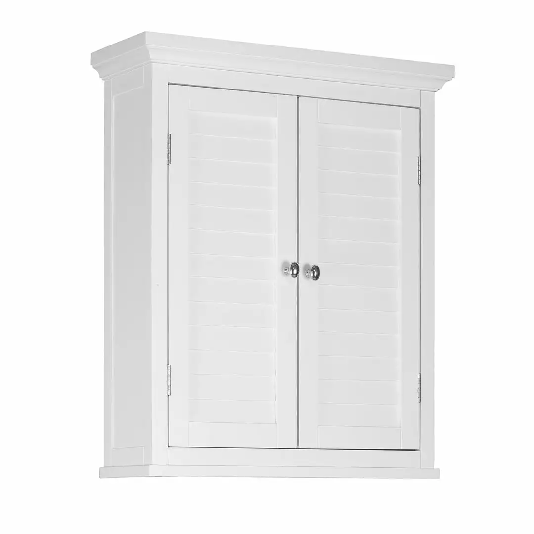 - STYLISH CABINET: Features a timeless white finish with a crown molded top and skirting, chrome-finished knobs and louvered doors for a beautiful addition to your space