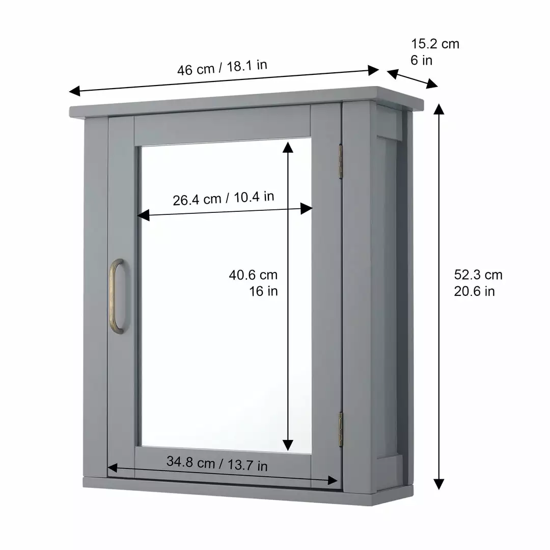 Upgrade your bathroom storage while adding mid-century modern decor with the Teamson Home Mercer Mid Century Modern Wooden Medicine Cabinet. This decorative cabinet features a gray finish with a mirror door and brass pull for an elevated and stylish addition to your space. The included adjustable shelf offers customizable and functional storage that is great for storing toothbrushes, toothpaste, soaps, lotions, and more to reduce clutter and keep your bathroom tidy. Constructed from durable engineered wood, this medicine cabinet is built to provide you with long-lasting organization. Easy, step-by-step instructions and all of the hardware needed are included for quick assembly. Purchase this stylish cabinet alone or with other items from the Mercer collection for a cohesive, updated look. The Teamson Home Teamson Home Mercer Wooden Medicine Cabinet measures 6″ x 18″ x 20.6″ to add storage in narrow spaces.