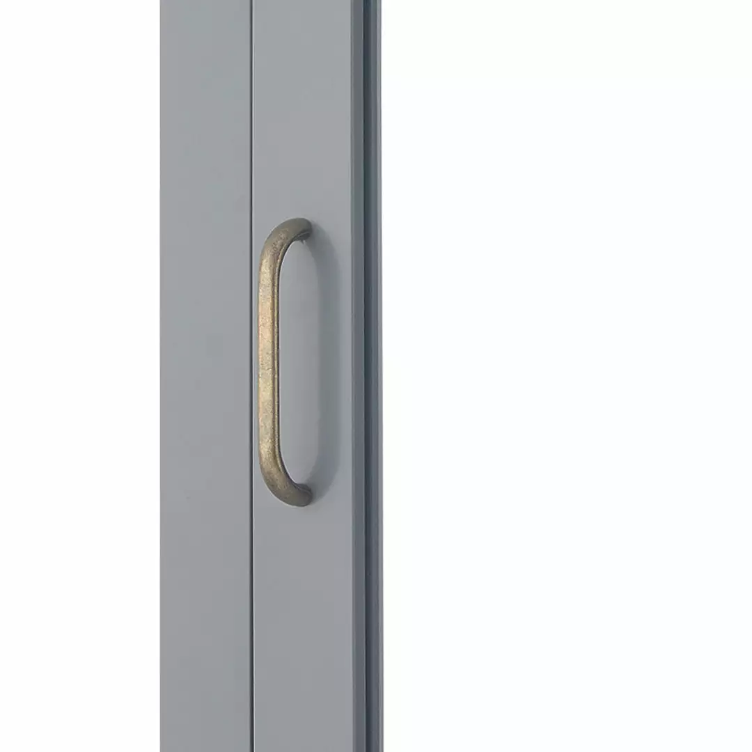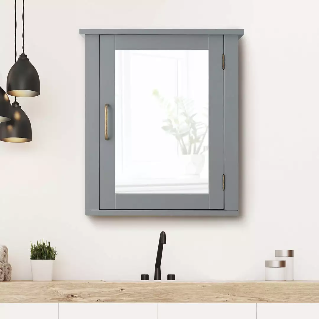 - STYLISH CABINET: Features a sleek gray finish with a mirrored door and brass pull hardware for an elevated and stylish addition to your space