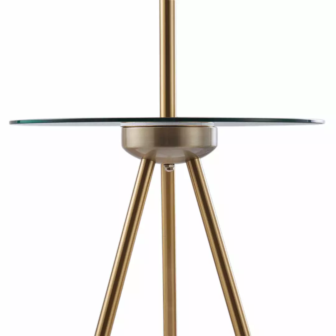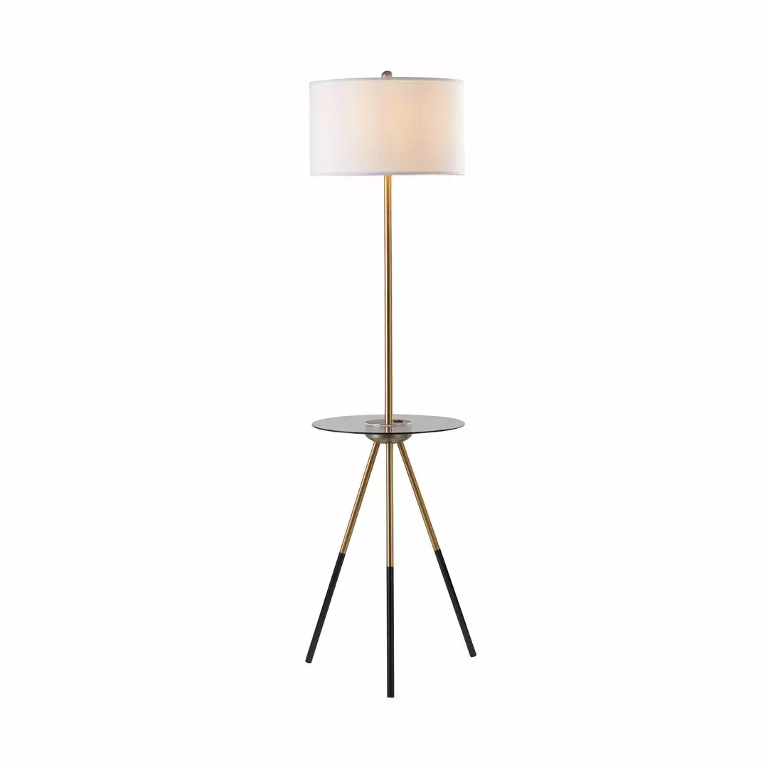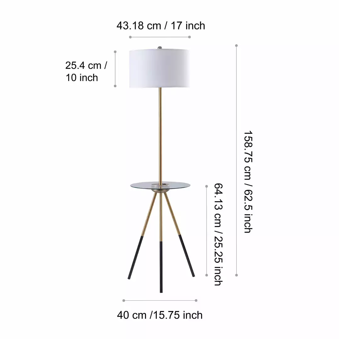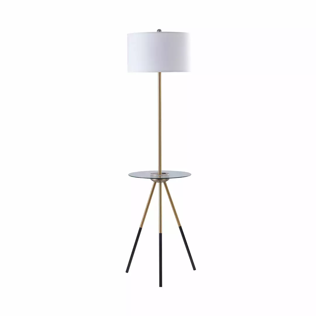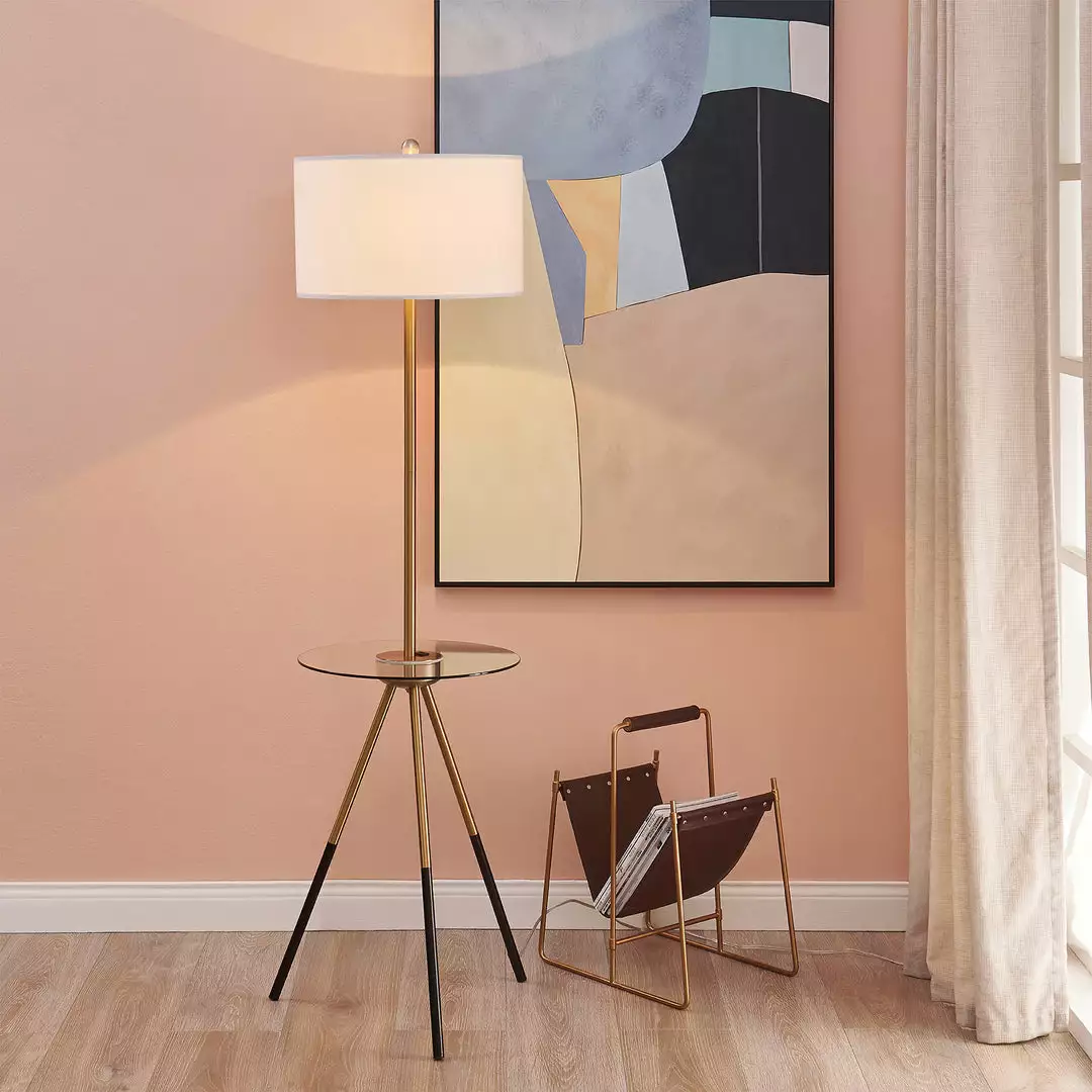 - MODERN FLOOR LAMP AND TABLE: Features a metal tripod base with a gold finish, a white drum shade, and a glass tabletop for a modern addition to your bedroom or living space