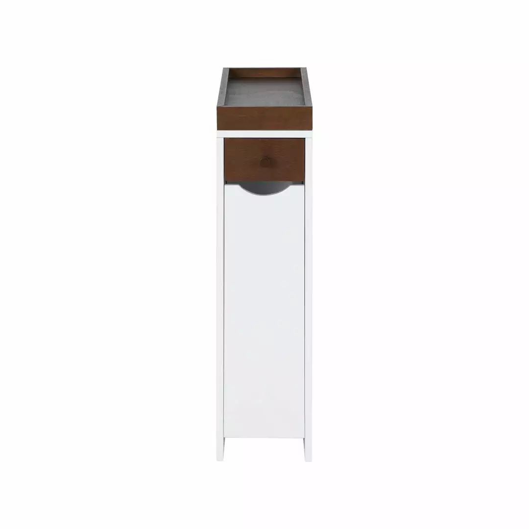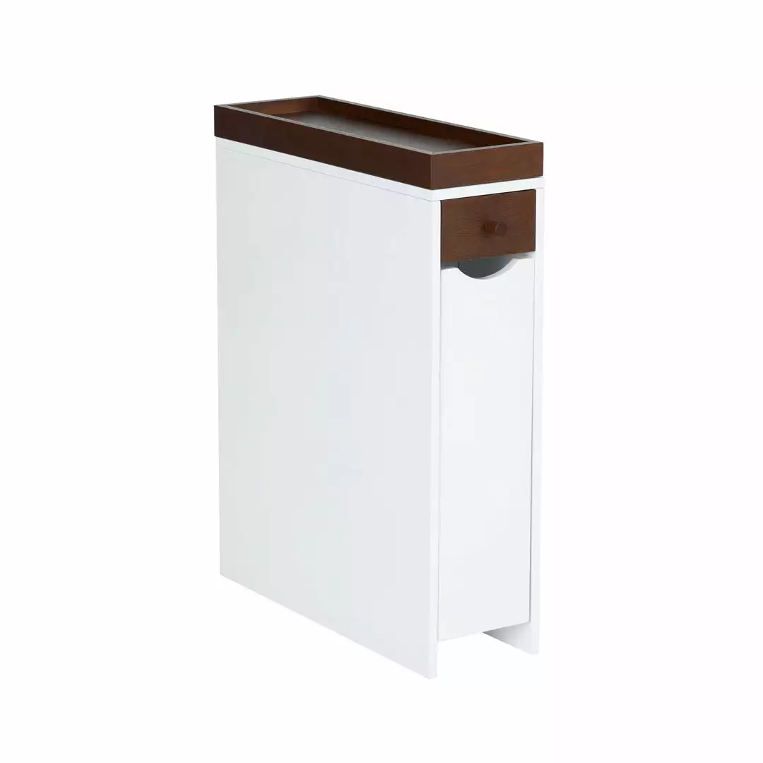 Solve your storage needs with the Teamson Home Narrow Cabinet with Storage Drawers. This two-tone farmhouse style cabinet is the perfect solution to tight spaces in the bathroom, bedroom, kitchen, or office. Hidden storage in the slide out drawer includes multiple compartments for keeping cleaning supplies, toiletries or kitchen utensils. A small top drawer can be used to organize items that require quick access. This multipurpose white cabinet features a removable wooden tray which can be used next to the bathtub to hold your book and candles, or in the kitchen as a snack tray. Freestanding cabinet measures 6.5″ long, 19″ deep, and 24.5″ tall to fit just about anywhere – between the sink and toilet, underneath a countertop and more!
