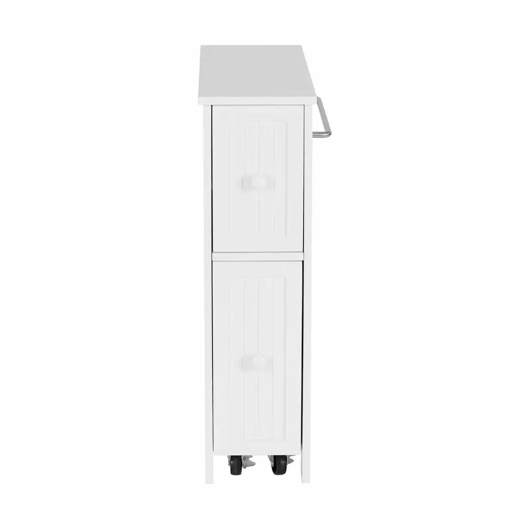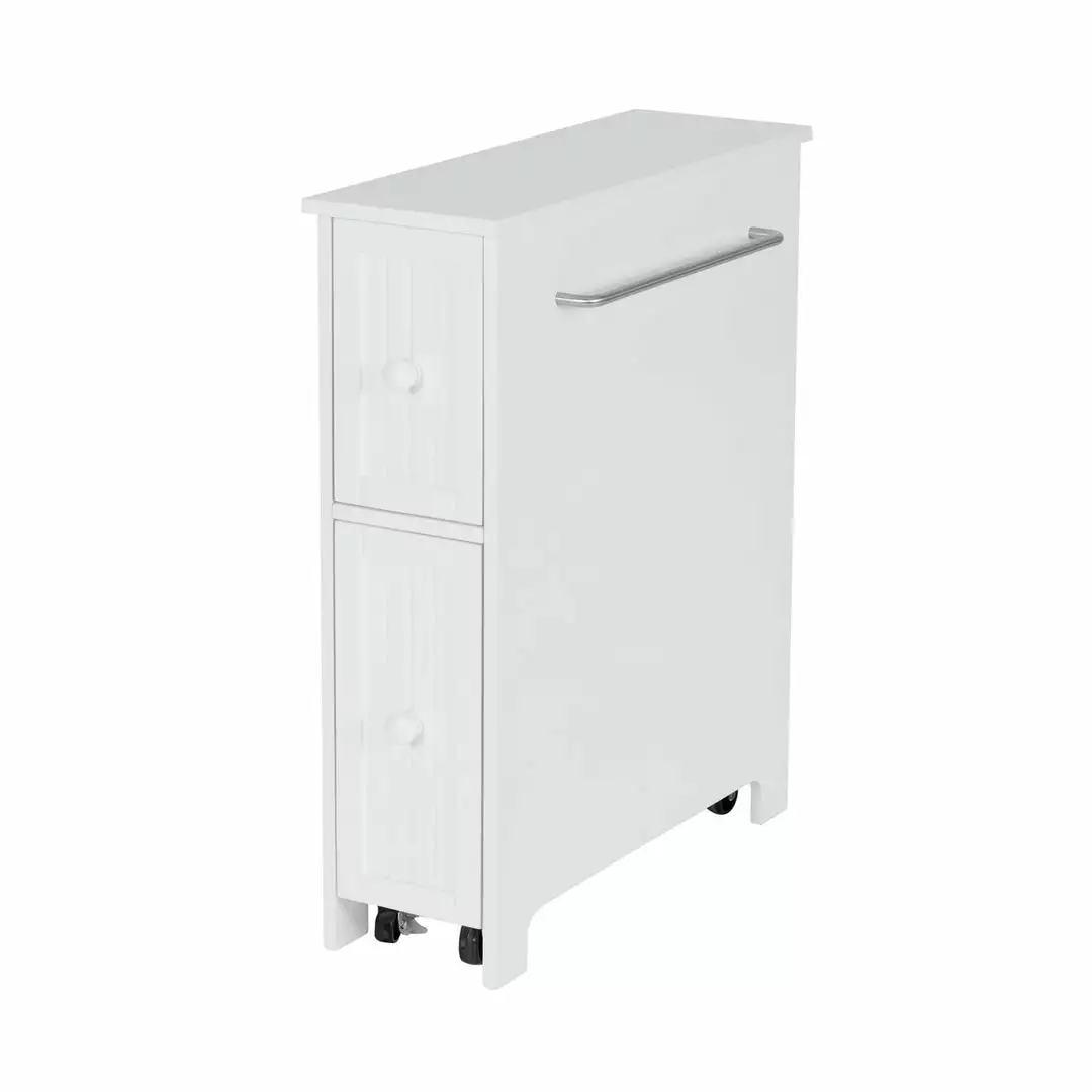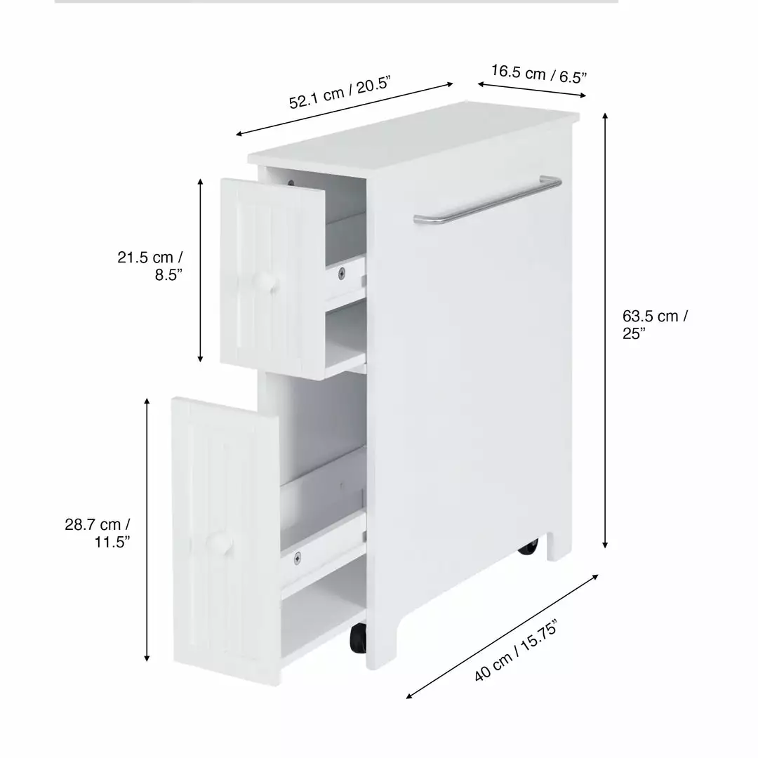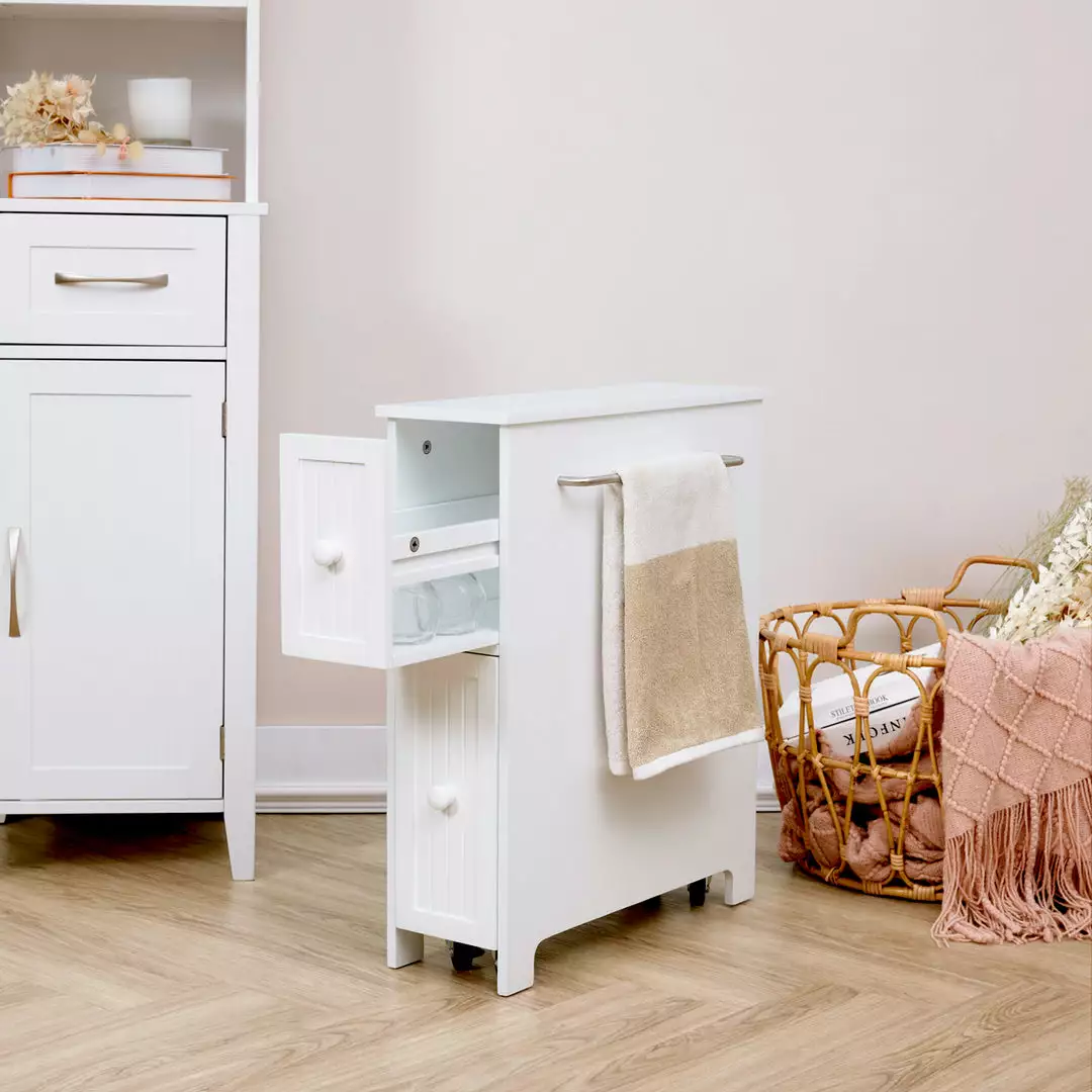 - INCLUDED: One white cabinet with a top drawer, larger bottom drawer, towel bar, and easy glide casters.