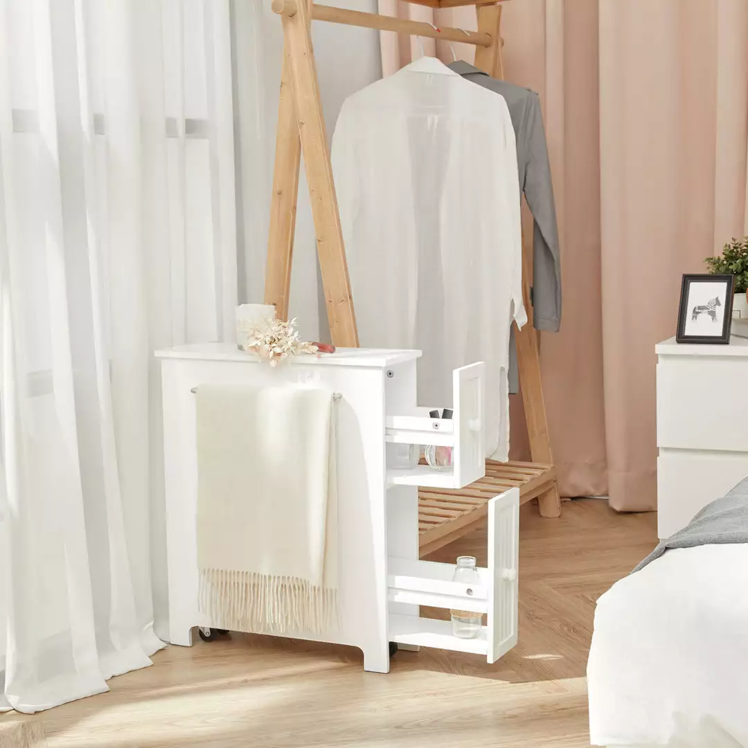 Teamson Home Narrow Cabinet with Storage Drawers and Towel Bar 6.5″ L x 25″ H, White