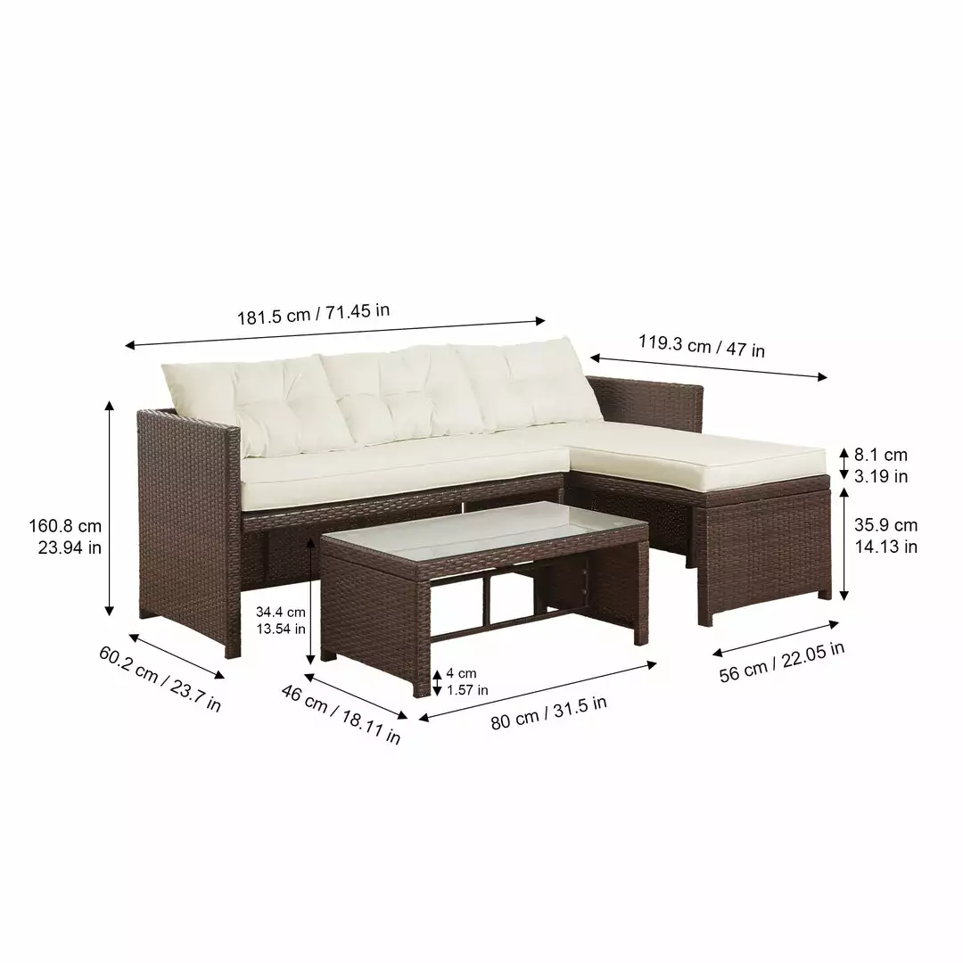 Teamson Home Outdoor 3-Piece Rattan Patio Sectional Set with Loveseat, Chaise Lounge and Coffee Table, Brown/White