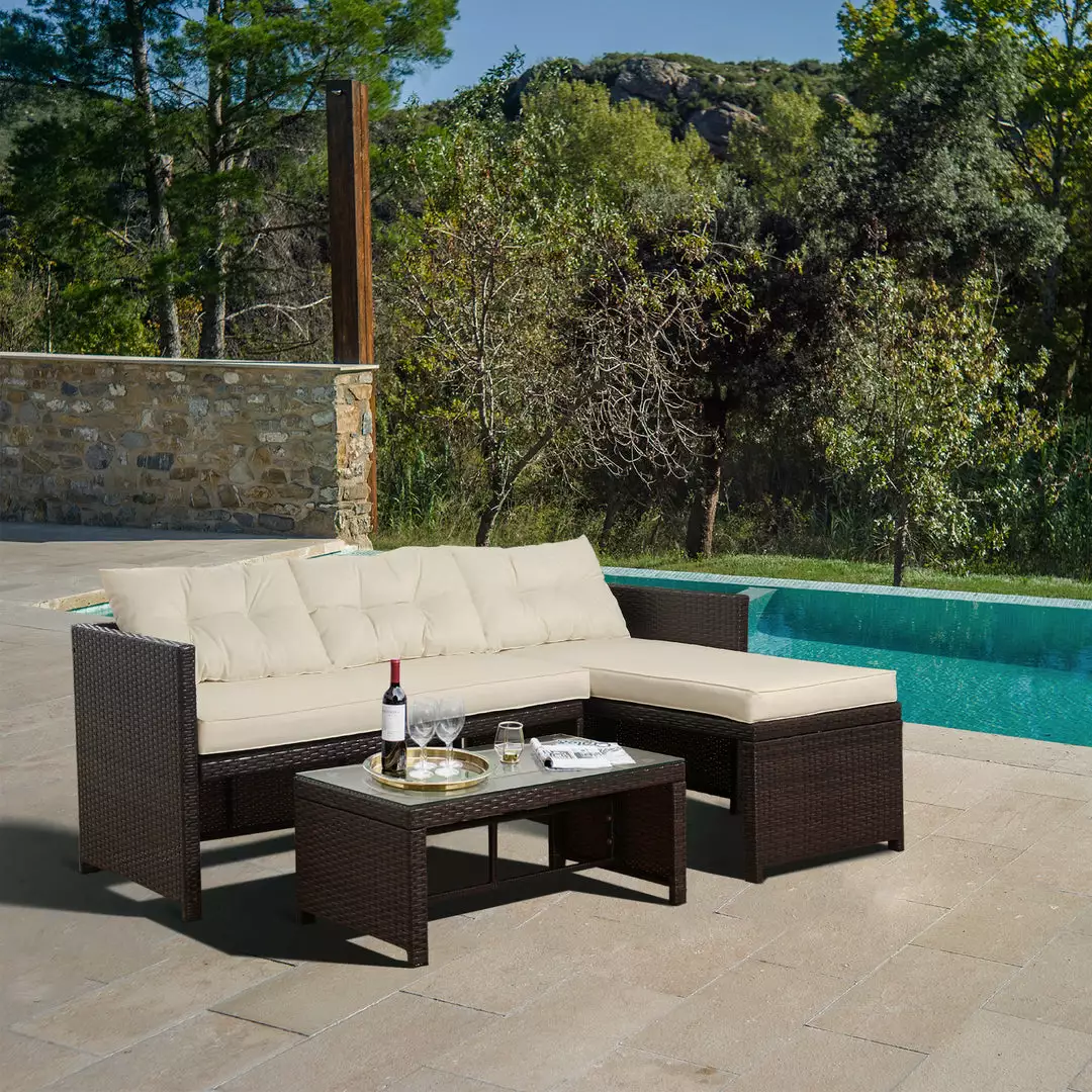 - RATTAN PATIO SECTIONAL SET: Includes a two-person loveseat, chaise lounge, and coffee table to add comfortable seating to your backyard, patio, deck, front porch, balcony, or any outdoor space