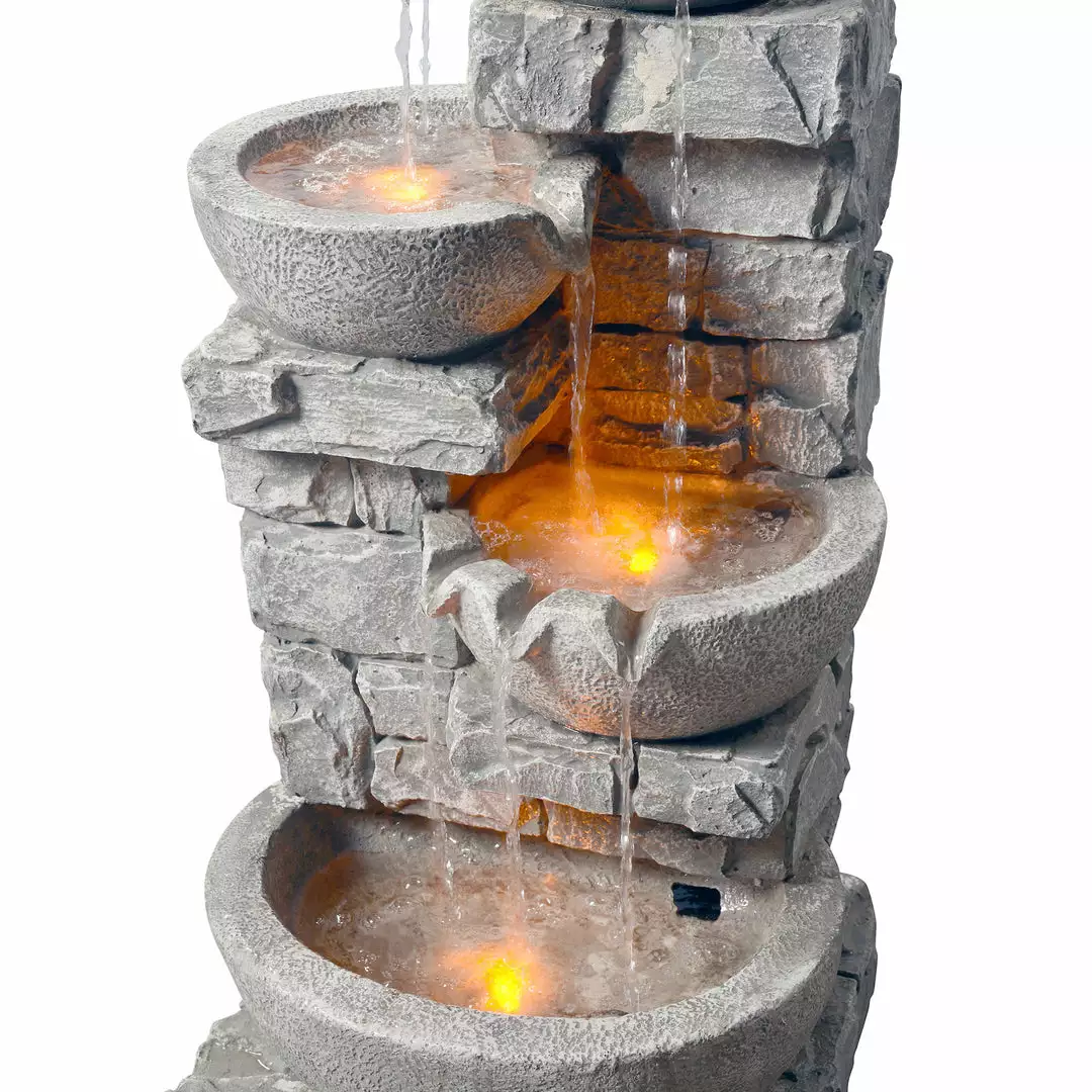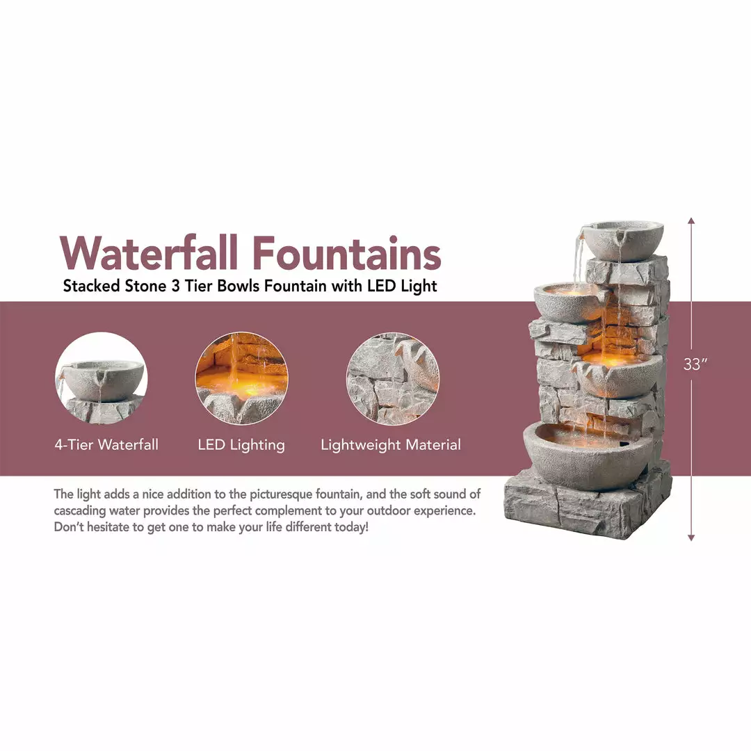Experience spa-like tranquility right in your back yard with the Teamson Home Outdoor Stacked Stone Tiered Fountain with LED lights. Embrace the soothing ambiance of cascading water and cool lights that set the tone for a nice, relaxing evening. This 3-layered faux stone garden fountain is made from durable weather, and rust-resistant polyresin and is the perfect addition to any outdoor space.