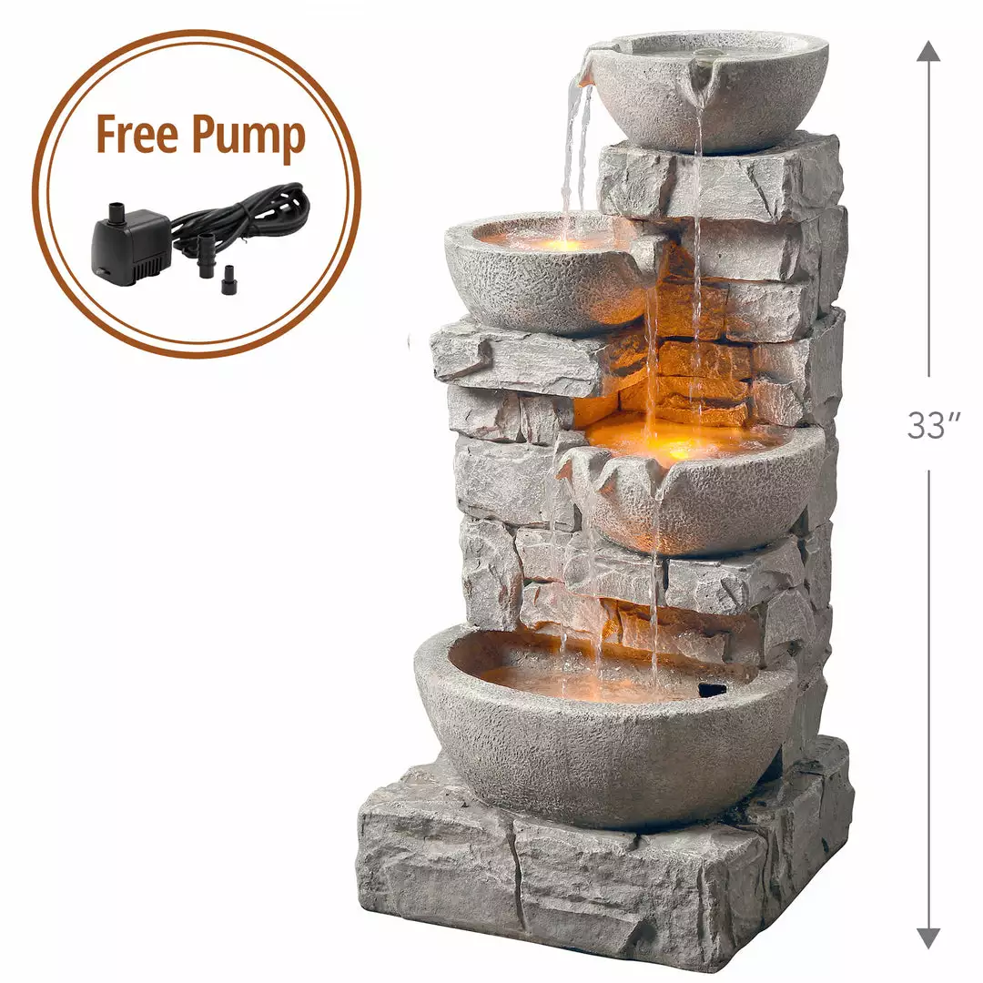 - INCLUDED LED LIGHTS: Built-in LED lights keep the fountain lit to illuminate your garden