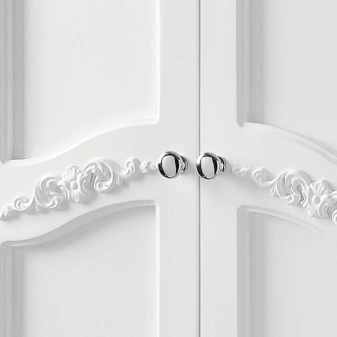 - STYLISH CABINET: Features a white finish with a crown molded top, metal knobs, and engraved doors for a timeless addition to your space