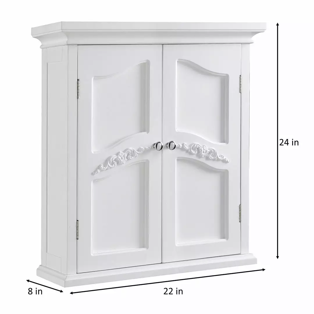 Upgrade your home storage while adding classic style with the Teamson Homes Versailles Wooden Removable Wall Cabinet with 2 Shelves. This decorative cabinet features a white finish with a crown molded top, metal knobs, and engraved doors for a timeless addition to your space. The 2 included adjustable shelves make this cabinet functional and customizable to suit your storage needs. Constructed from durable engineered wood, this storage unit is built to provide you with long-lasting organization. Easy, step-by-step instructions and all of the hardware are included for quick assembly. Purchase this stylish wall cabinet alone or with other items from the Versailles collection for a cohesive, updated look. The Teamson Homes Versailles Wooden Removable Wall Cabinet with 2 Shelves measures 8″ x 22″ x 24″ to provide removable storage without taking up too much space in your living area.