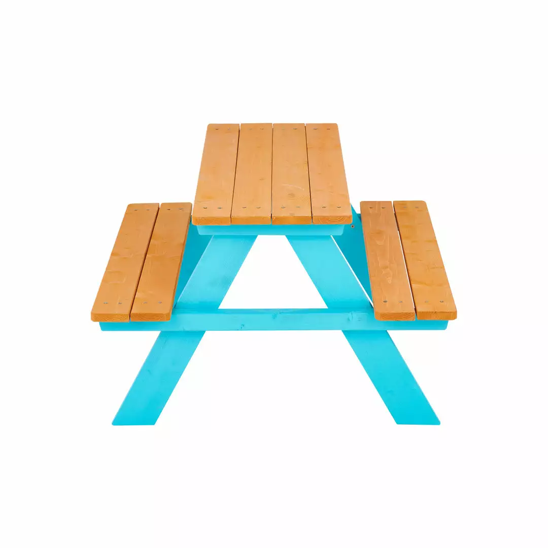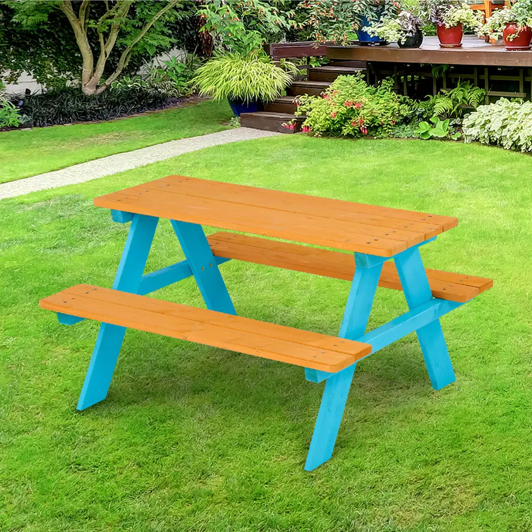 Teamson Kids’ solid wood picnic table features a warm honey color stained finish with a bright aqua base. The built-in benches offer seating for multiple kids around a durable solid wood A-frame. This table is ideal for any outdoor activities including snacktime and crafttime. The picnic set is made of spruce wood with an environmently friendly waterbased stain. To keep this table looking new, treat with a wood stain each year and store in a dry place for the winter. This kid sized table measures 35″ long, 31″ deep, and 19.75″ tall and is suitable for children ages 3 and up.