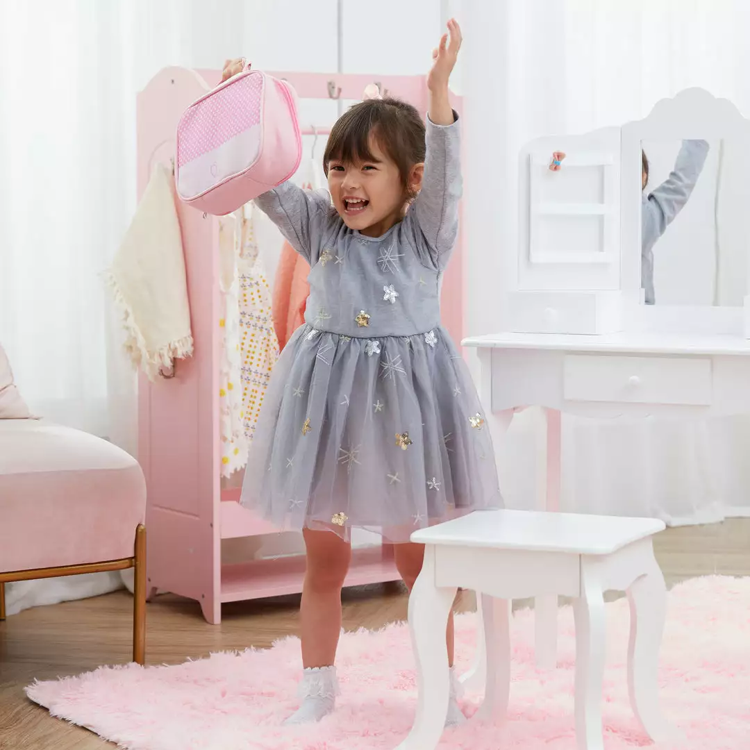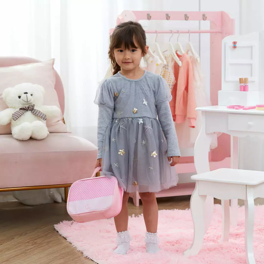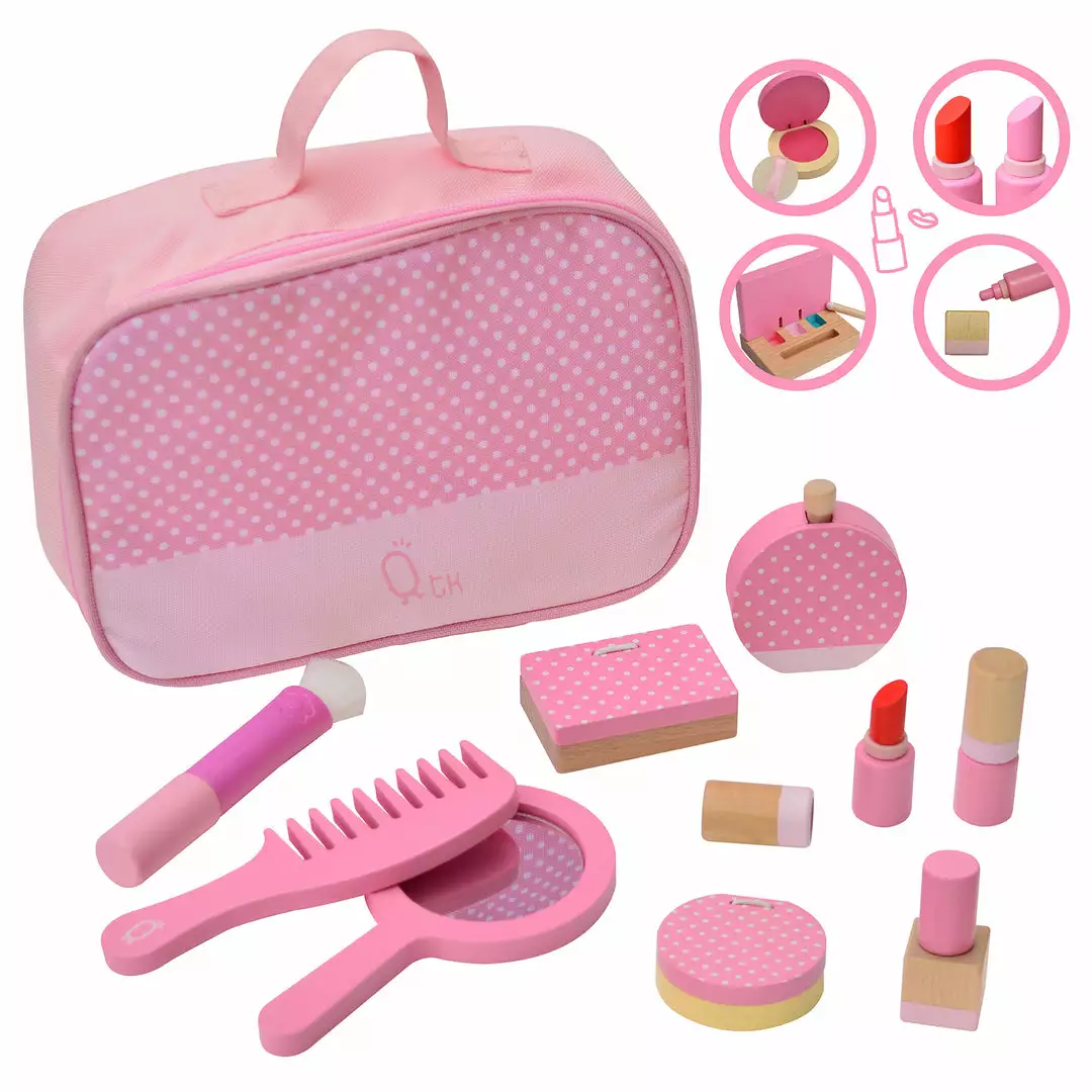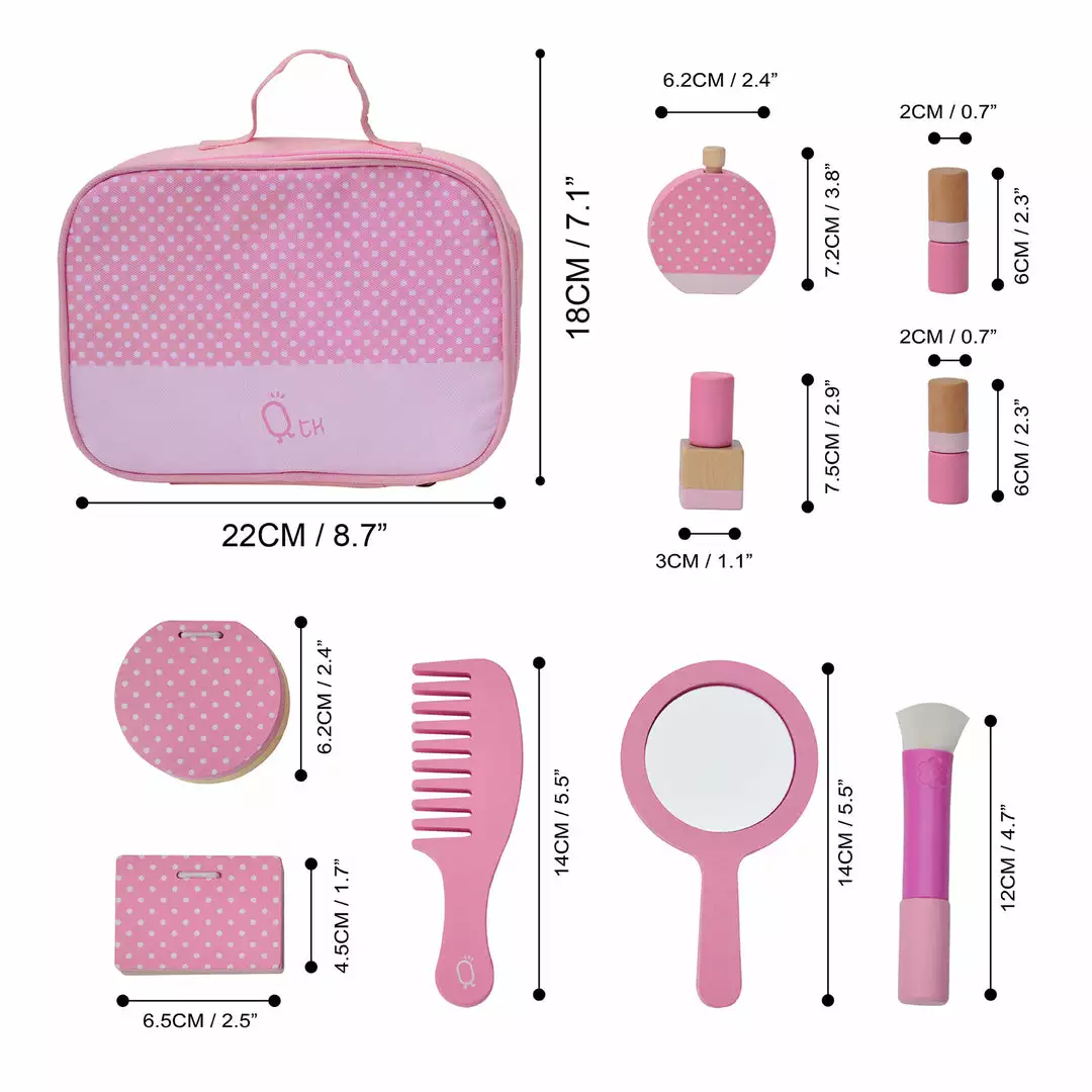 Give your little one everything they need to get ready for the day all by themselves with the Teamson Kids Chloe Wooden Makeup Set. This 10-piece set features bright pink and polka dot finishes and it completes any Teamson play vanity. This kit offers a variety of cosmetics and applicators to help your little princess practice their makeup skills. This makeup set includes a mirror, comb, makeup brush, eyeshadow palette, blush compact, perfume, two lipsticks, nail polish, and a makeup bag to complete your little one’s play experience. All of the pieces have a kid-sized design that’s made for little hands. The durable wood construction is kid-safe and easy to clean for every day messes. The set measures 8.75″ x 3″ x 7″ for convenient storage in cabinets, drawers, and toy boxes when not in use.