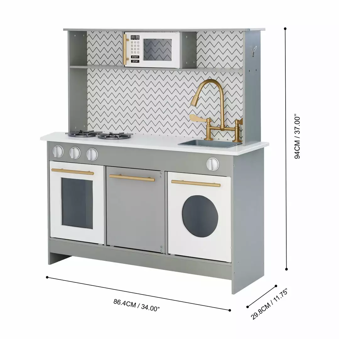 Give your little ones a kitchen of their own with the Teamson Kids Little Chef Berlin Classic Kids Kitchen Playset. This modern play kitchen is designed with a cool gray and white look with and gold accents, making it great for both boys and girls, and it completes any home, classroom, preschool, or daycare playroom. The functional and interactive design features openable oven and microwave doors, three turning oven knobs, two oven burners, two drawers, a sink with a gold faucet, and an under-sink cabinet to enhance your little ones play time. With 6 included accessories – a cordless phone, spatula, pot, pan, lid, and chopping board – this toddler kitchen encourages role play and lights up your little chefÂ’s imagination and creativity. The durable and eco-friendly MDF construction is kid-safe and easy to wipe clean with a damp cloth for every day messes. The easy-to-follow instructions allow for quick adult assembly so play time can start right away. This kid-sized toy kitchen measures 34″ x 11.75″ x 37″ and is recommended for children ages 3 years and up.