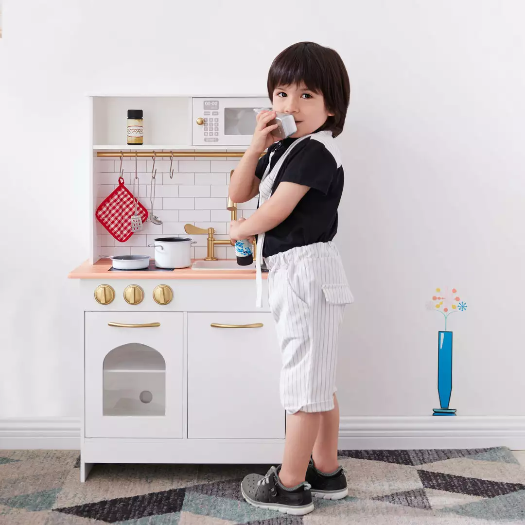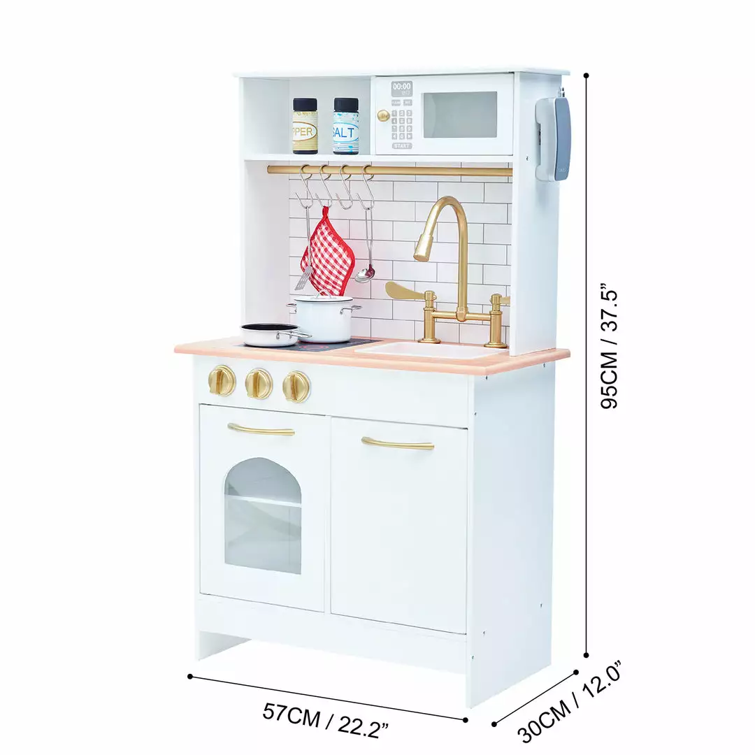 Give your little one their own cooking space with the Teamson Kids Little Chef Boston Classic Kids Kitchen Playset. This white retro-style play kitchen features a natural wood countertop, white brick backsplash and gold hardware, making it great for both boys and girls, and it completes any home, classroom, or playroom. The interactive design features openable oven and microwave doors, 3 turning oven knobs, 3 oven burners, shelf, sink, rod with hooks and cabinet to enhance your little one’s play time. Included accessories feature realistic details with a pot holder, ladle, spatula, phone, pot & lid, pan, plus salt & pepper shakers! This toddler kitchen encourages role play and lights up your little chef’s imagination and creativity. The durable and eco-friendly MDF construction is kid-safe and easy to wipe clean with a damp cloth for every day messes. The easy-to-follow instructions allow for quick adult assembly so play time can start right away. This kid-sized toy kitchen measures 22.25″ x 12″ x 37.5″ and is recommended for children ages 3 years and up.