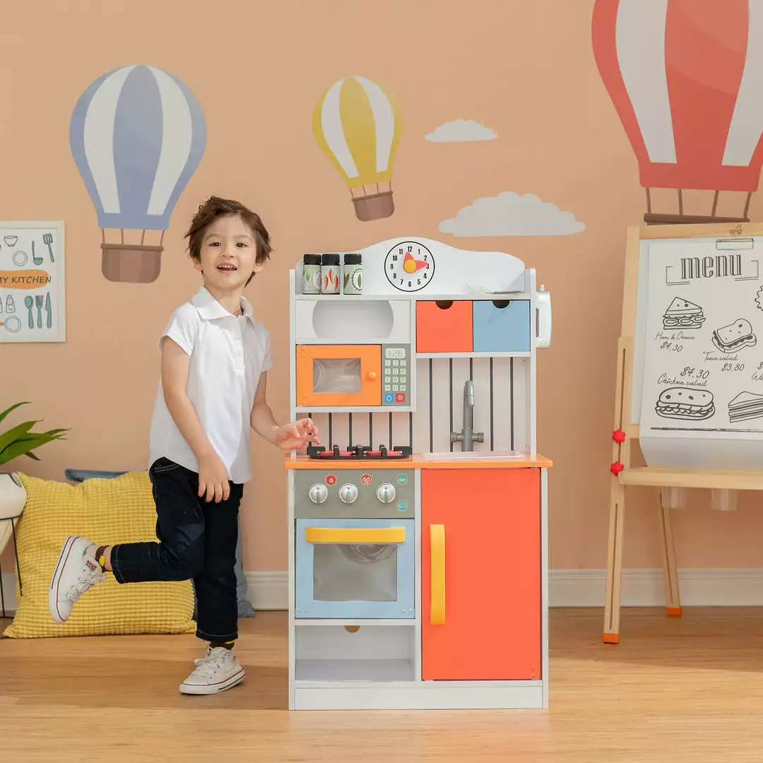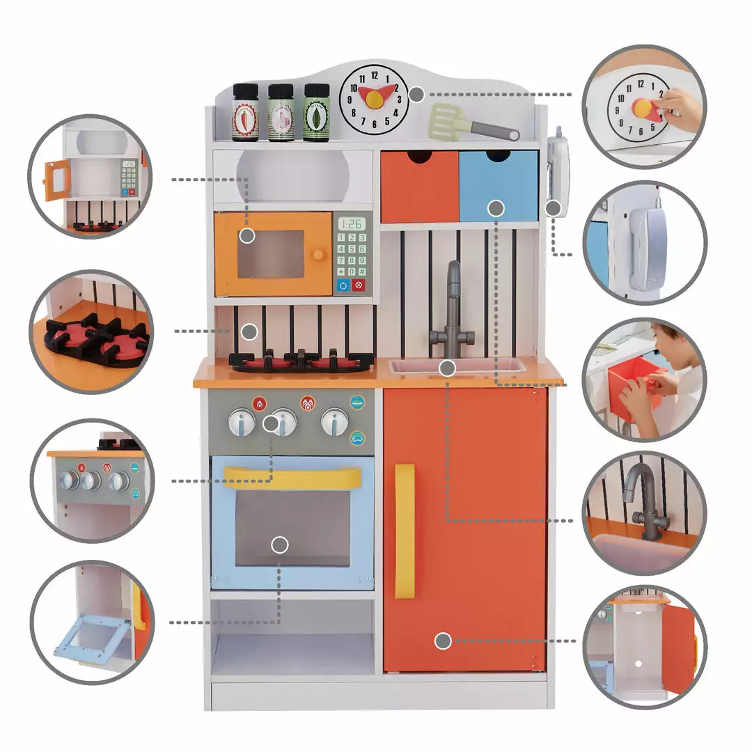 - KIDS PLAY KITCHEN SET: Retro-style kitchen playset with brightly colored accents is great for both boys and girls and completes any home, classroom, preschool, or daycare playroom