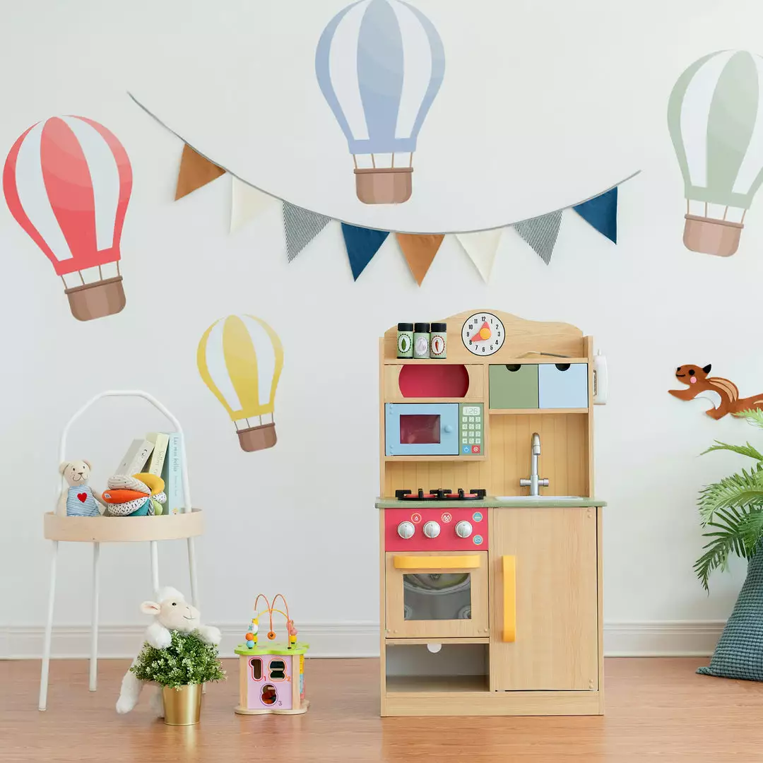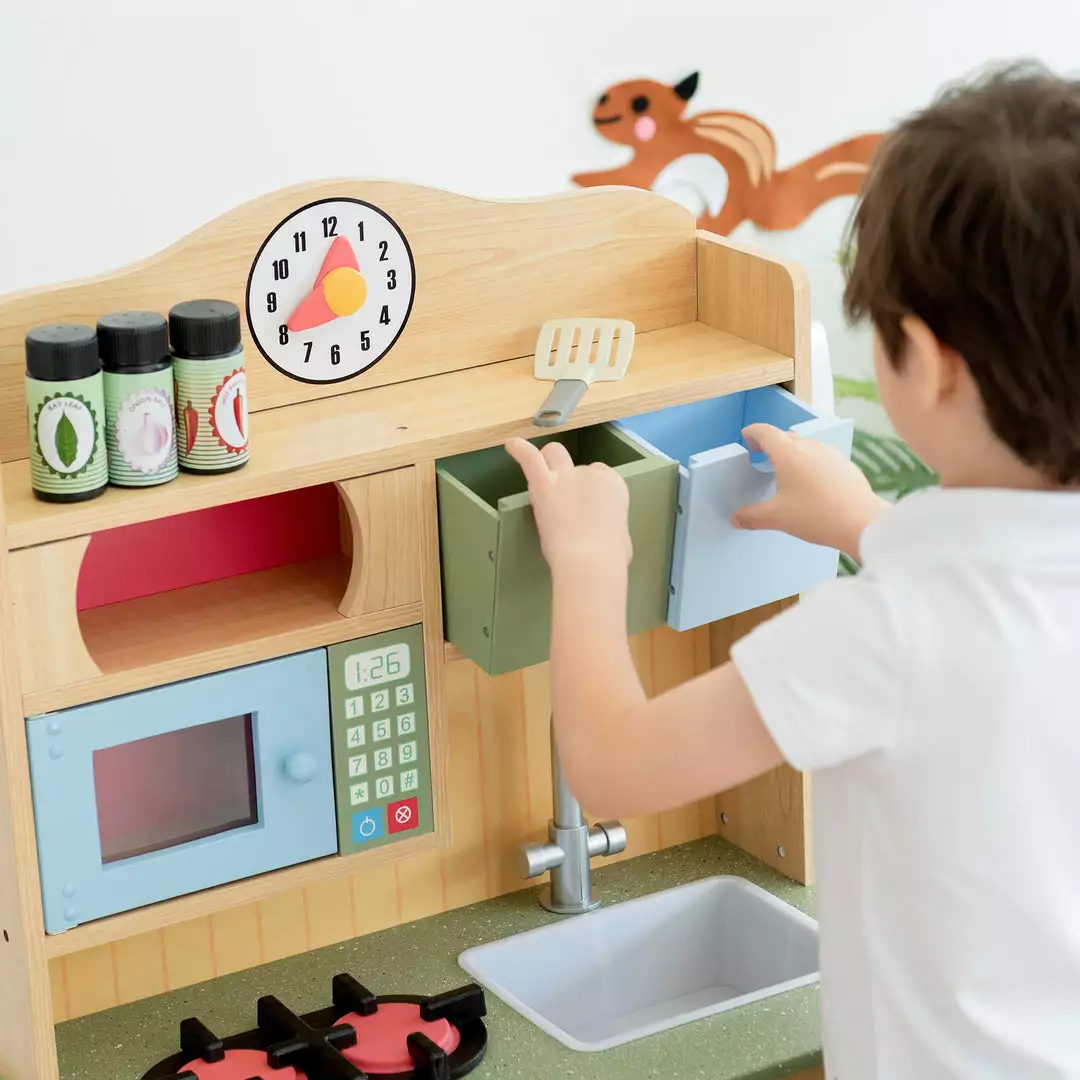 Help your little one create gourmet meals of their own with the Teamson Kids Little Chef Florence Kids Kitchen Playset. This classic play kitchen is designed with a timeless wood grain finish with primary , making it great for both boys and girls. This kitchen’s interactive design includes opening oven and microwave doors, 2 turning and clicking oven knobs, 2 oven burners, 2 drawers, a sink, an under-sink cabinet, and a toy clock to make playtime more realistic. With 5 included accessories, including a cordless phone, spatula, and three plastic shakers, this pretend play kitchen encourages role play and sparks your little chefÂ’s imagination. This play set’s durable and eco-friendly MDF construction is kid-safe and easy to clean for easy upkeep. The step-by-step instructions allow for quick adult assembly so play time can start right away. This kid-sized toy kitchen measures 21.5” x 11.63” x 35.5” and is recommended for children ages 3 years and up.