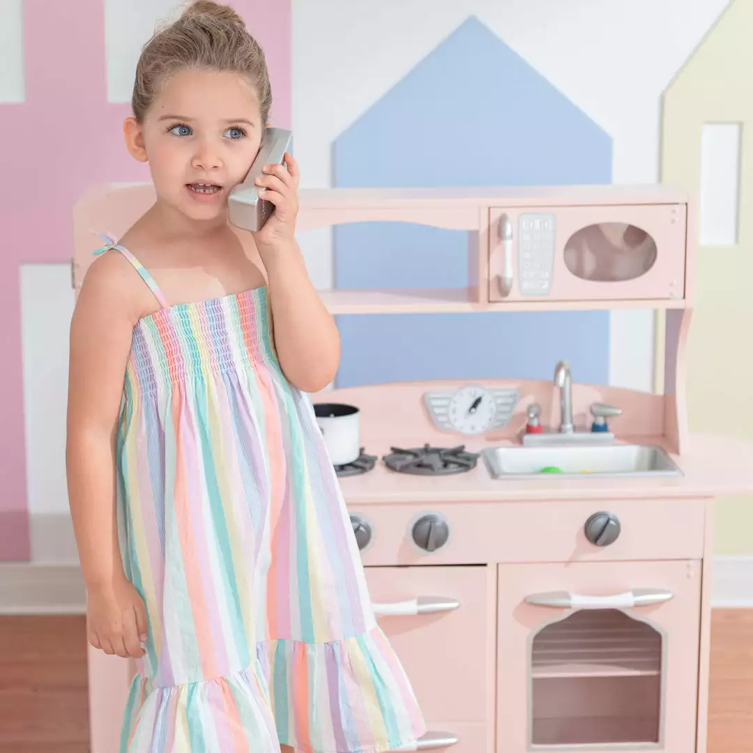 Your little chef will love cooking in the Teamson Kids Westchester Pink Retro Kitchen. Kids and toddlers will love pretending to use the refrigerator, microwave, stove, oven, and sink. The kitchen’s durable design and moving parts will keep your child active and entertained. Constructed from MDF longevity, designed for children ages 3 & up.