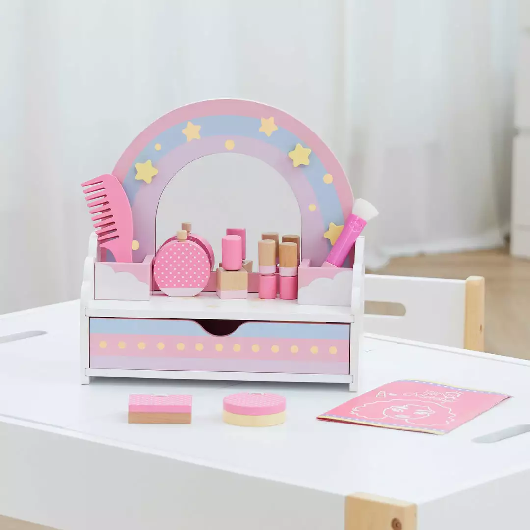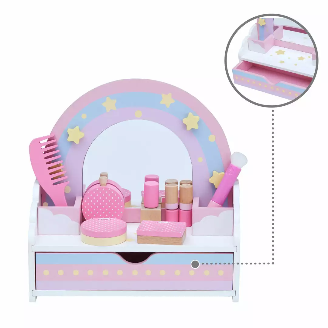 - BUILT-IN STORAGE: Rainbow mirror with functional star hooks offer storage for jewelry and hair accessories, while the two open compartments and drawer provide space for the included play makeup