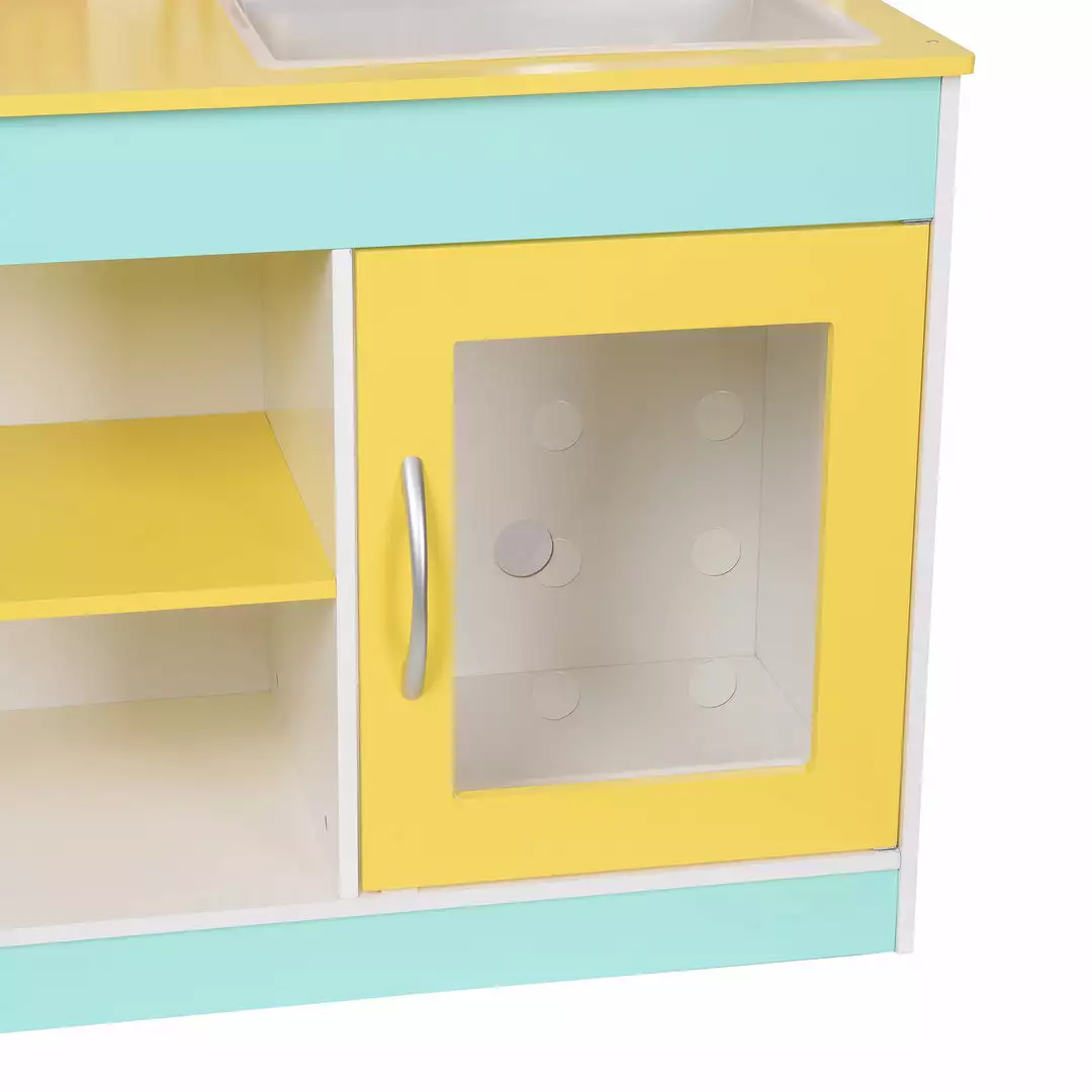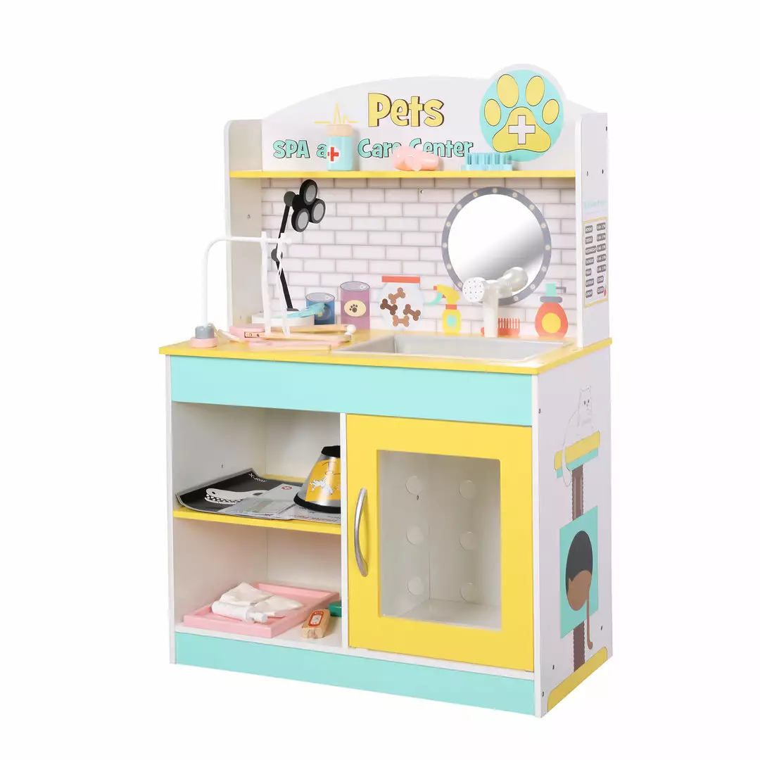 Give your little one everything they need to take care of their stuffed animals with the Teamson Kids Little Helper Pet Care and Vet Clinic Playset. This kids activity set features teal and yellow finishes with a subway tile and silver accents, making it great for both boys and girls, and it completes any home, classroom, preschool, or daycare playroom. The functional and interactive design features a leash pole to hold their furry friends, a kennel with transparent door, a sink, and a clock with rotating pointer to enhance your little one’s play time. With the included pretend vet exam accessories – a feed bowl, x-ray, health checklist, prescription, syringe, scissors, stethoscope, medicine jar, thermometer, comb, hairdryer, tray, two gauzes, tongue depressor, handed mirror, doctor hammer, recovery collar, and doctor ID holder with card – this set encourages role play and lights up your little veterinarian’s imagination and creativity. The durable MDF construction is kid-safe and easy to wipe clean for every day messes. The easy-to-follow instructions allow for quick adult assembly so play time can start right away. This kid-sized vet playset measures 23.5″ x 11.75″ x 34″ and is recommended for children ages 3 years and up.