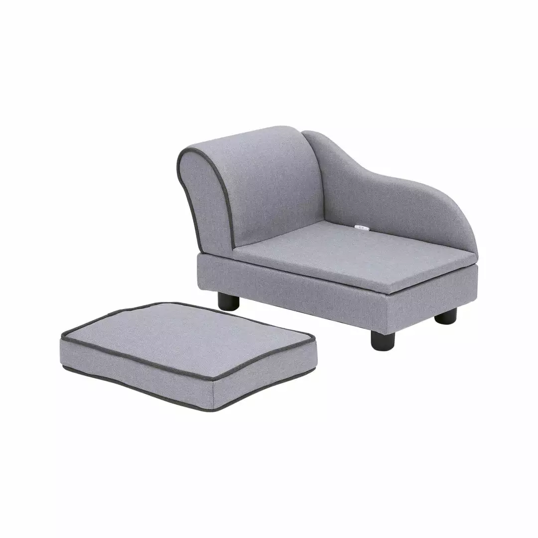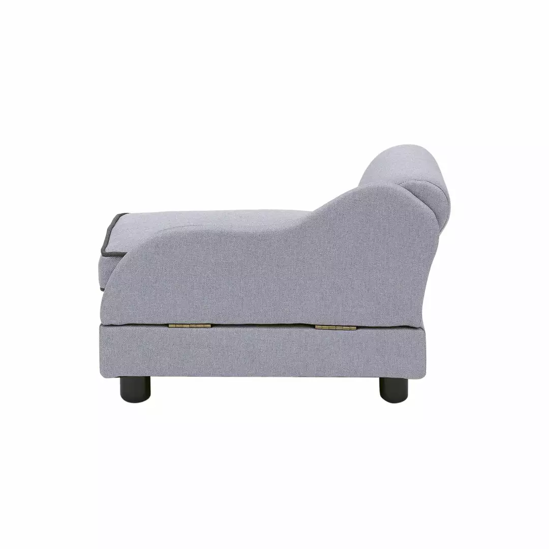 - INCLUDED: Chaise-style bed for cats and small dogs features one arm and a scalloped back, removable cushion, and hidden storage compartment underneath.