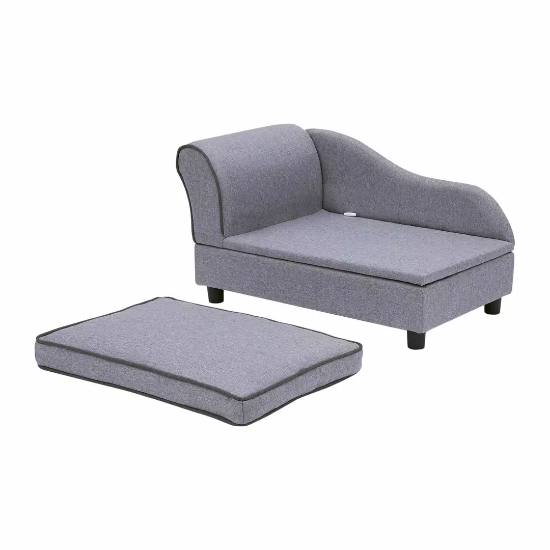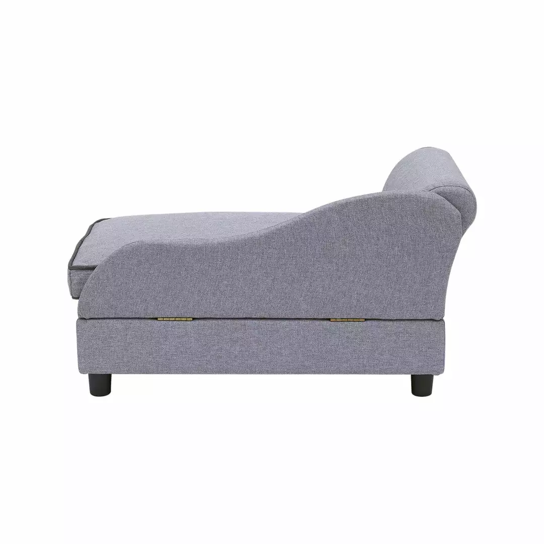 - INCLUDED: Chaise-style bed for medium dogs features one arm and a scalloped back, removable cushion, and hidden storage compartment underneath.