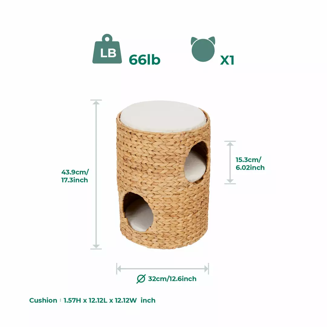 Add a stylish and functional accent to your home with the Teamson Pets Neith Woven Seagrass 3-Tier Cat Bed Condo. This activity tower features three levels to provide cats with a place to jump, play, and rest – the two lower tiers offer covered dens for cats to relax and sleep in, and the top tier acts as a perch for them to jump onto during playtime. The cream colored cotton fabric cushions on all three tiers of the house keep cats comfortable during naps, and are removable and washable for easy cleaning. With its natural seagrass design, this versatile cat bed complements existing home decor and can be placed in living rooms, family rooms, hallways, bedrooms, offices, and more. The sturdy barrel-shaped frame offers stability and long-lasting durability, while the smooth woven surface is burr-free and will not get caught in their fur while in use. This multi-level cat bed condo measures 12.5″ long, 12.5″ deep, and 17.25″ tall with a 66 lb. weight capacity, making it great for both single and multiple cat homes.
